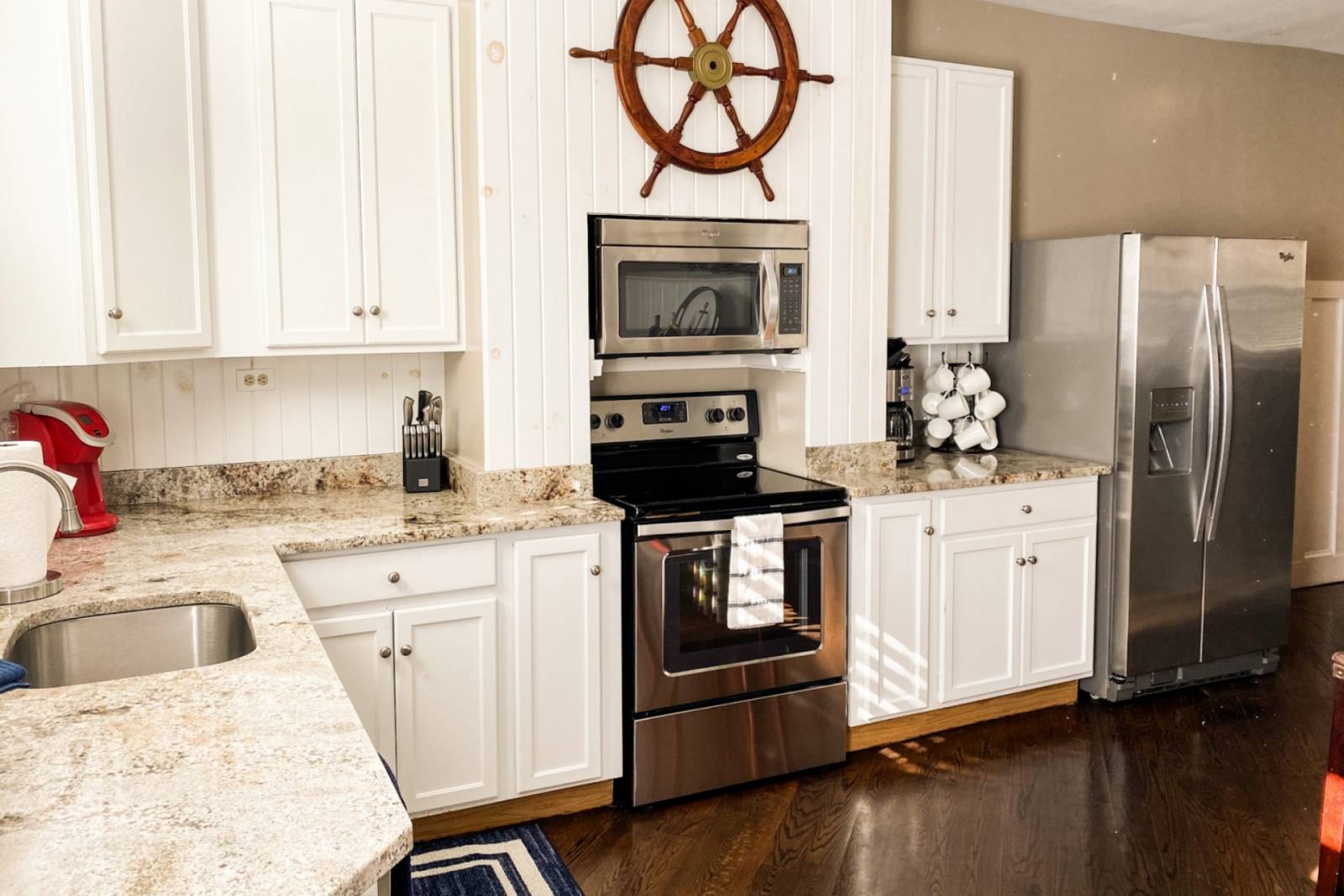 The interior boasts an elegant Great Room with a custom entertainment bar, open dining area, and Naval Academy-inspired decor that sets the tone for your stay. The gourmet kitchen is a chef’s dream, with seating at the breakfast bar for casual gatherings. With spacious accommodations for up to 11 guests, including a stunning top-floor suite, the home caters to families and groups seeking both comfort and style.