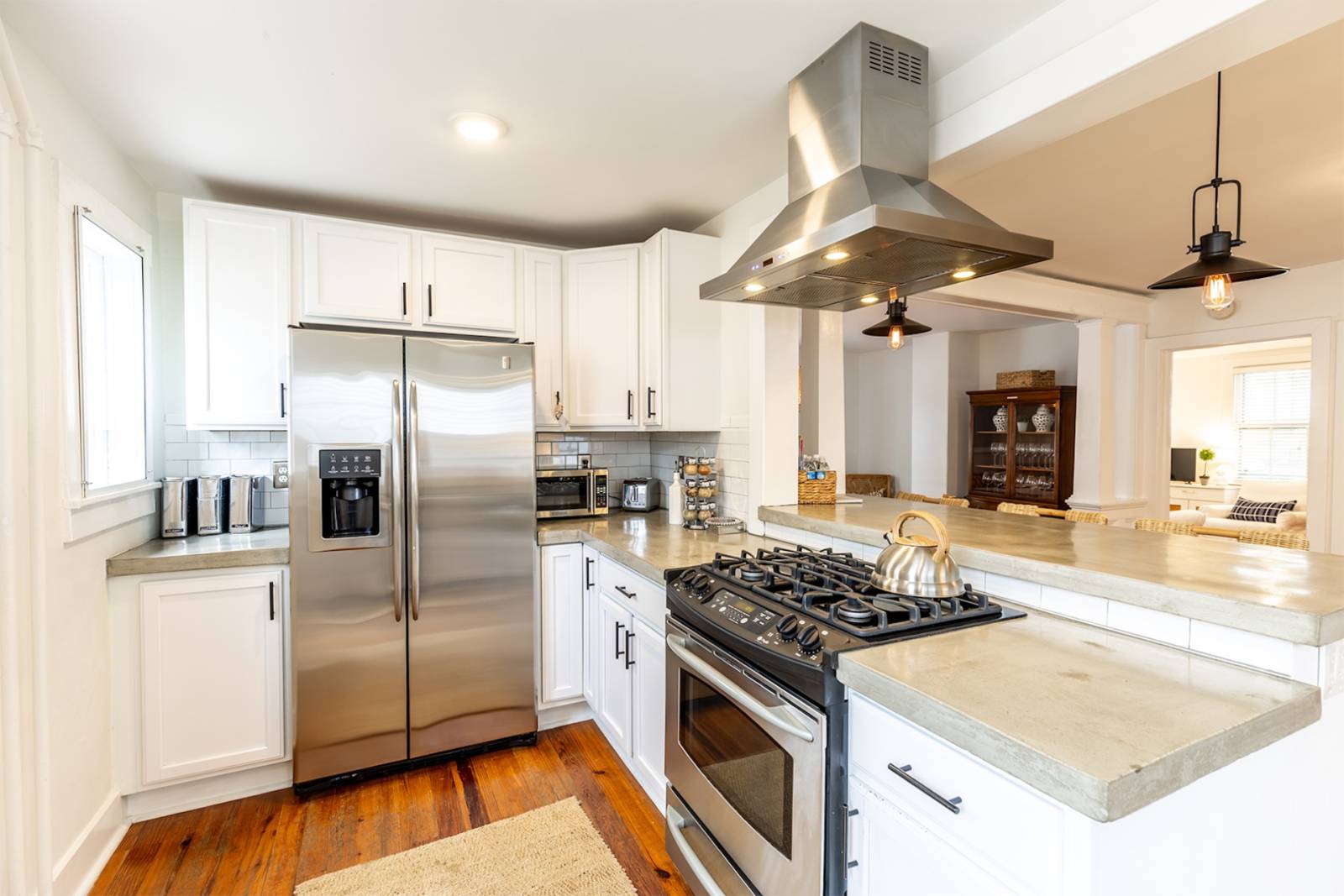 Gourmet Kitchen: Fully updated with custom cement countertops, breakfast bar, and wine fridge.