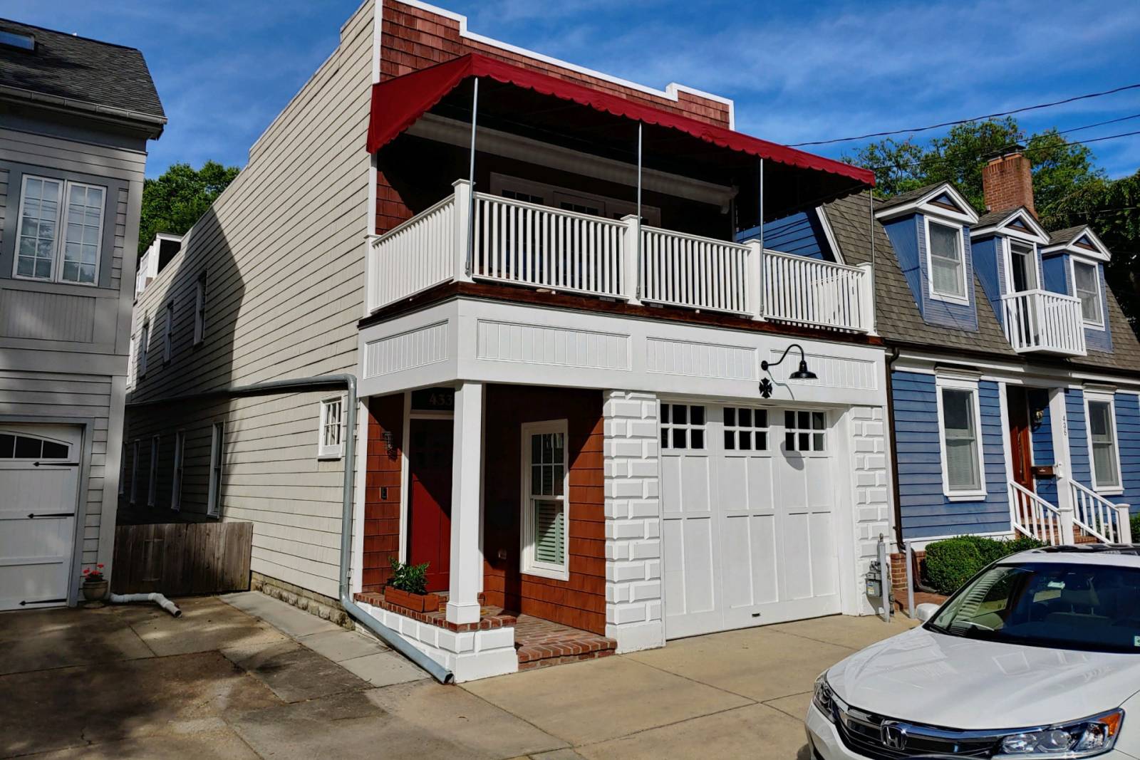 When entering the home on the first floor, you will be welcomed by the original brick floors in the foyer mudroom. Take the wooden staircase up to the second floor where you will find the 9-foot ceilings over the open kitchen, dining and family room which opens onto a fully-furnished screened-in porch with a gas fireplace. In addition to the living space, the 2nd floor has 2 En Suite bedrooms: the Master features its own large balcony facing the quiet neighborhood street. To find the living sleeping space on the first floor, either walk down the spiral staircase from the family room or enter from the garage door off the 1st floor entrance. The 1st floor has a full living/bedroom space with a queen bed, sleeper sofa and full bath and a 2nd living space/rec room with a kitchenette in the garage.