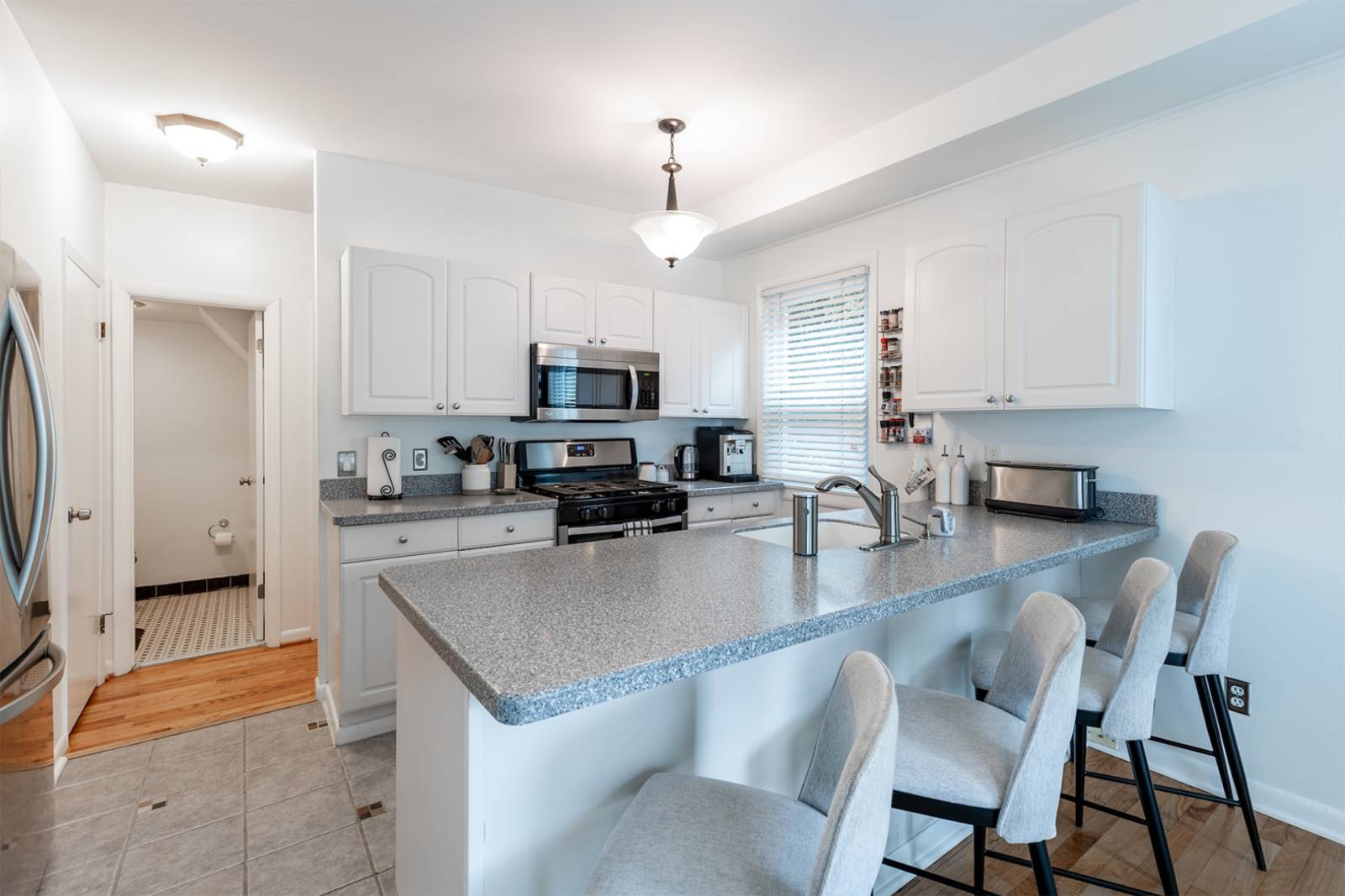 Kitchen & Dining: The recently renovated open kitchen features a breakfast bar, adjacent dining area, and sliding glass doors leading to a large deck.