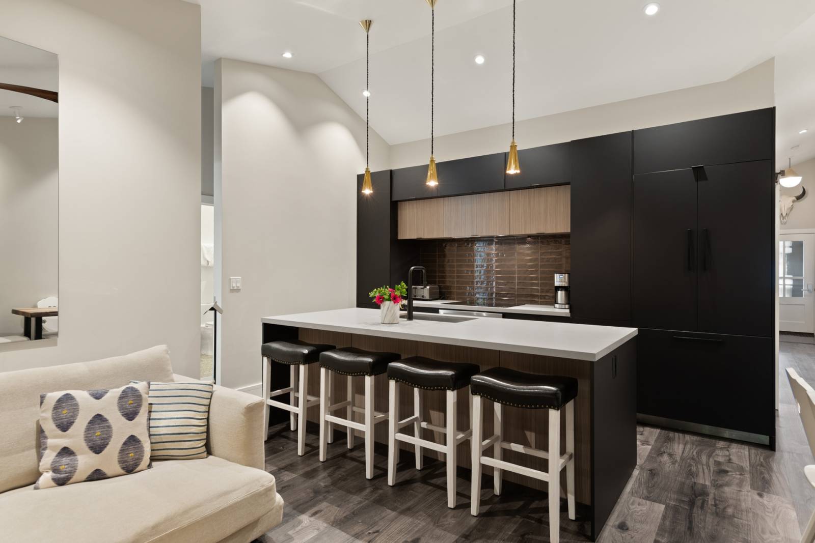 -Fully remodeled in 2021 with modern finishes featuring vaulted ceilings, contemporary furnishings, and a deluxe kitchen with Thermador induction cooktop