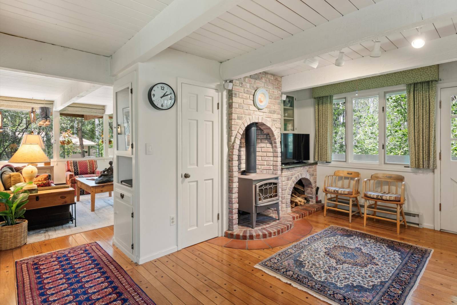 Living room with 55 inch flat screen TV and wood burning stove