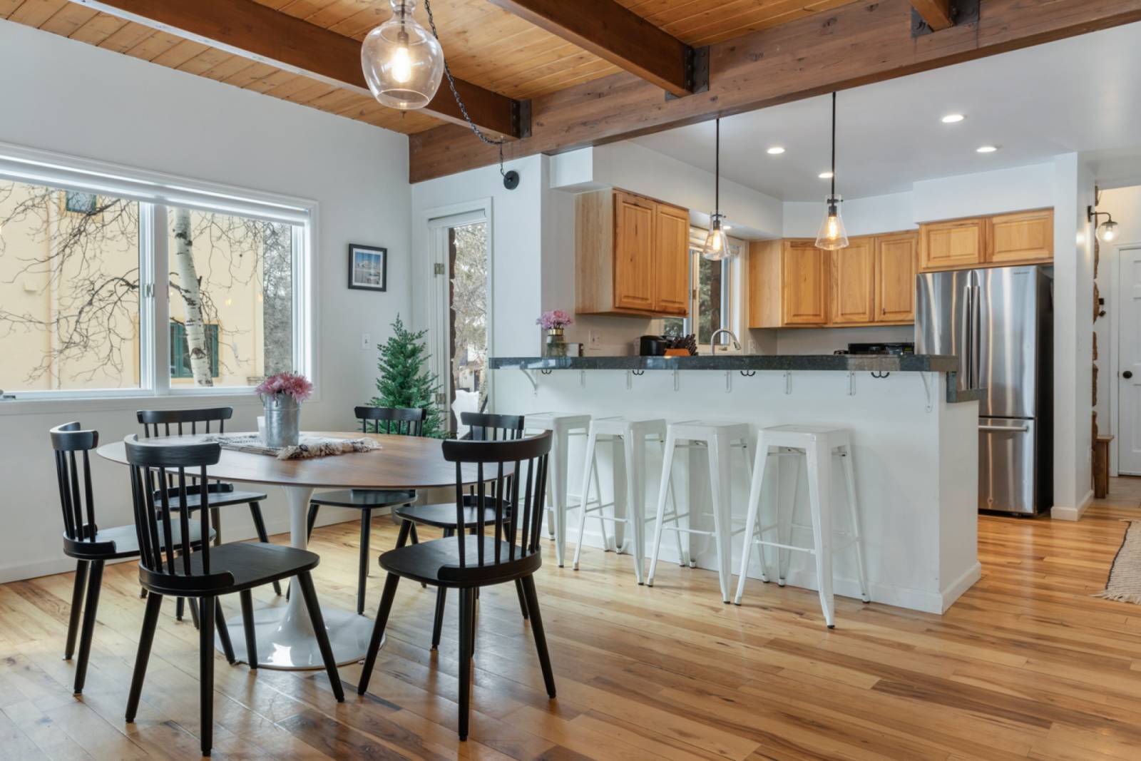 This duplex offers a spacious and inviting open-concept living area, perfect for creating memories with your loved ones. The kitchen is fully equipped and seamlessly flows into the dining area, where a table for six awaits. Enjoy preparing delicious meals while still being able to engage with your family or friends.