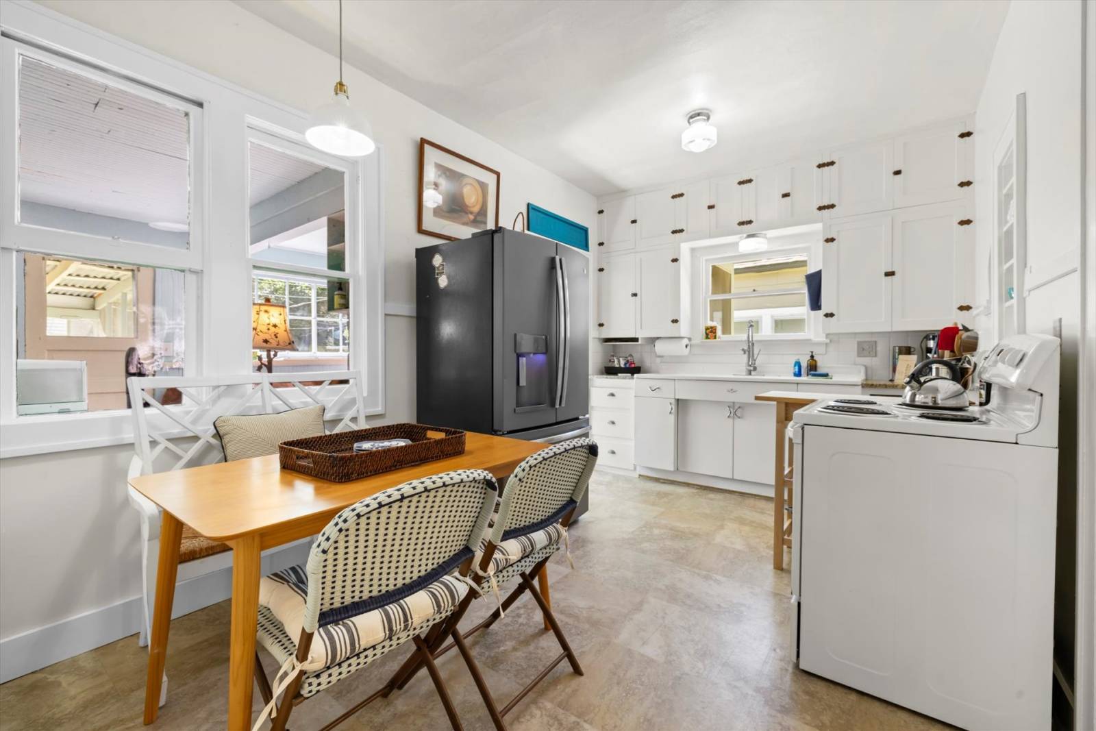 • Eat-in kitchen with charming white cabinets, modern appliances, and a breakfast nook for coffee or casual meals.
