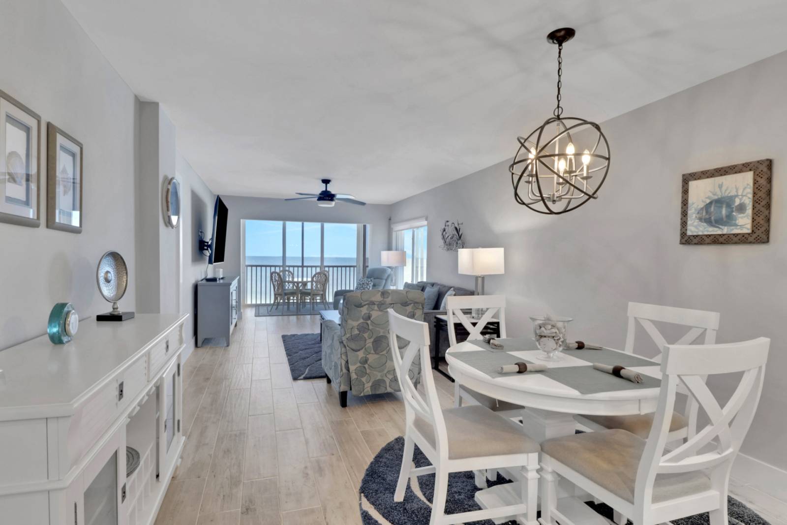 Corner unit, open concept main living area encompassing living room, dining area and open kitchen; the balcony/sunroom has been enclosed with hurricane rated sliding glass doors, extending the living area. During the cooler months, the sliding doors may be opened to enjoy the Gulf breeze and the sound of waves gently washing ashore