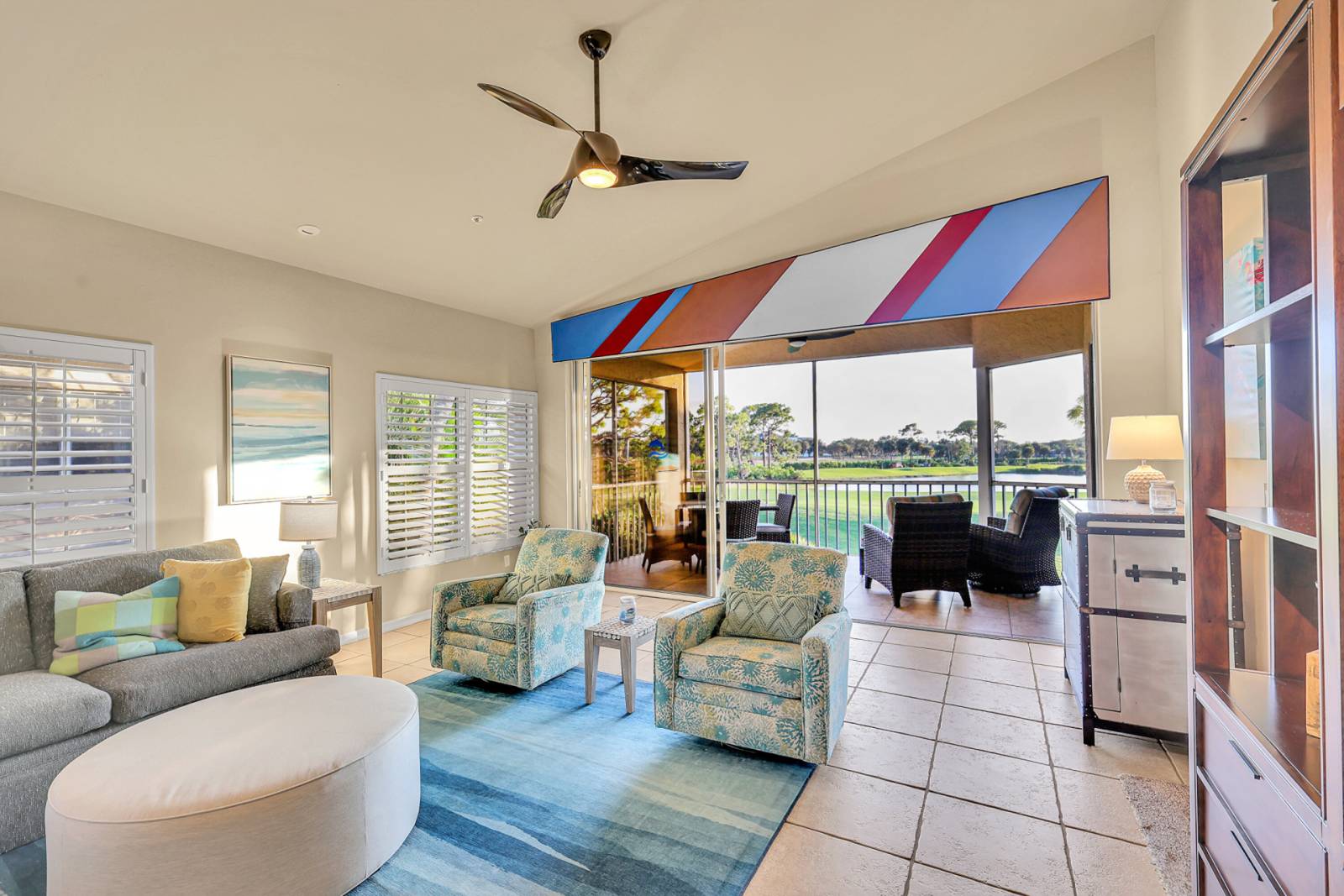 The vaulted, open living/dining area features comfortable furnishings, a large TV with cable and Firestick, and a dining table for six. Oversized sliding glass doors lead to a fully screened balcony overlooking one of Bonita Bays pristine fairways and lakes. There you'll find relaxing seating and a dining table - perfect or morning coffee or evening relaxation and just enjoying every minute of your beautiful vantage point.