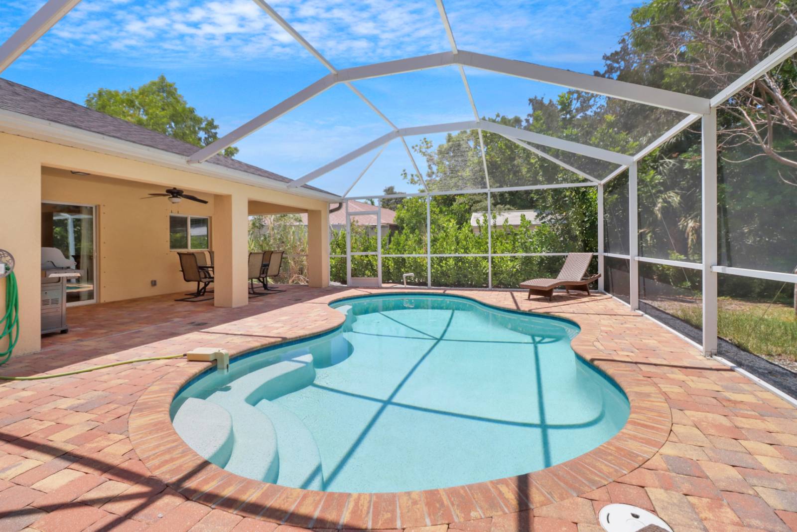 The private outdoor space includes a fully screened lanai, pool deck with heated pool, a pair of sun loungers and 6' privacy fence. An exterior ceiling fan provides an added breeze when relaxing under the shaded portion of the lanai, where you'll find the dining table for 6 and BBQ grill. Guests are responsible for purchasing replacement propane as needed.