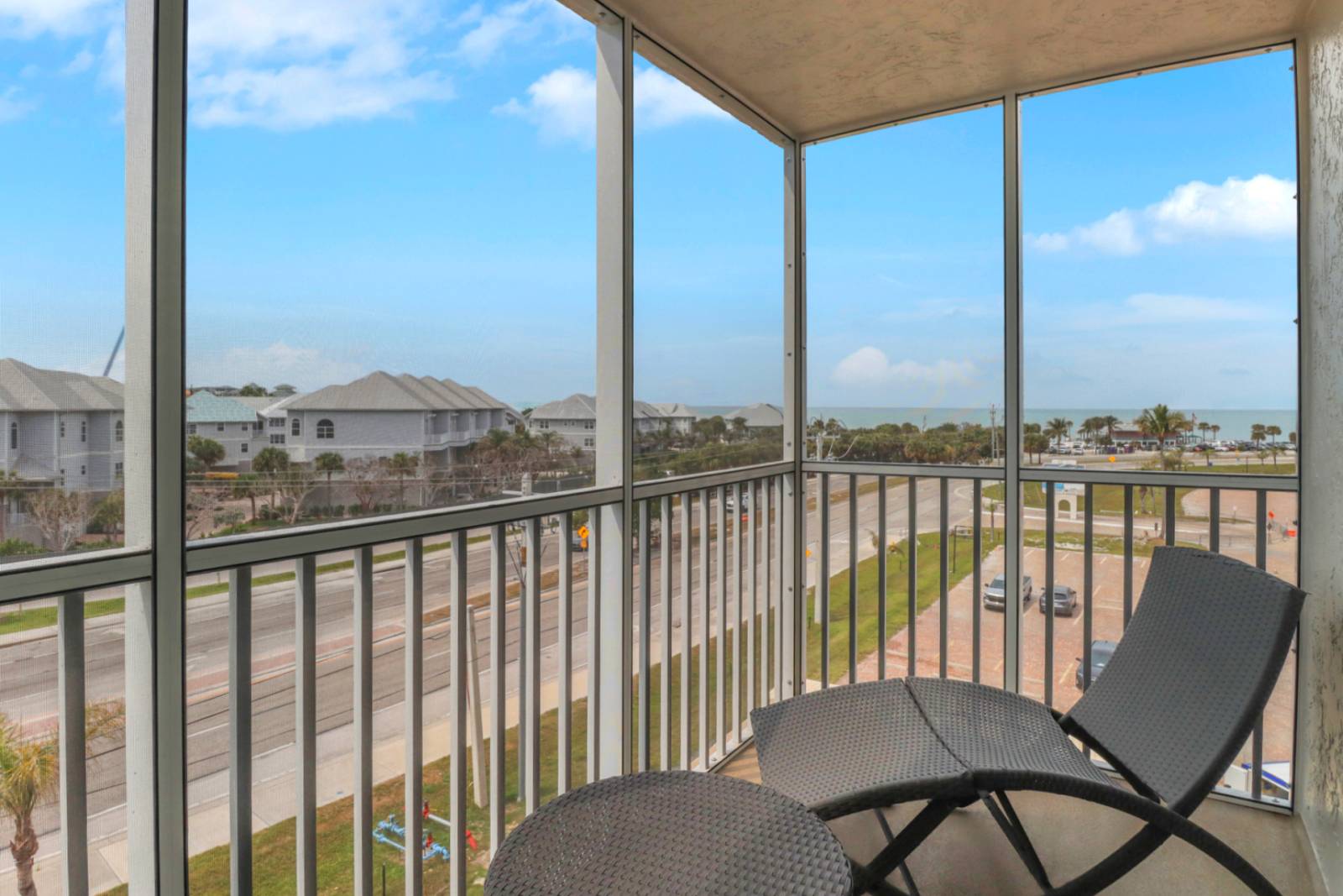 Living area includes a queen sleeper sofa, club chair, smart TV with community provided cable package and sliding glass doors with Plantation shutters opening to the screened balcony. The balcony has 2 lounge chairs with ottomans to relax and enjoy a side view of the Gulf and a view of the Barefoot Beach community.