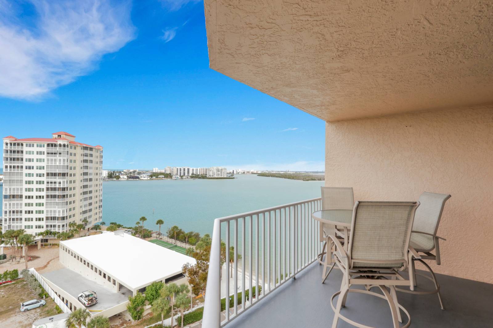 Extended private balcony showcases stunning Gulf, Bay, and Black Island views and has outdoor seating to sit ande enjoy morning coffee or evening sunsets