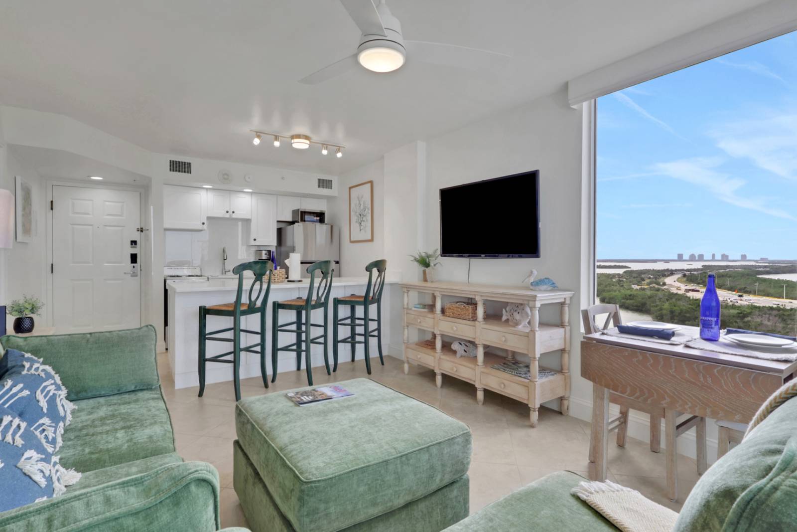 This 11th-floor condominium enjoys sweeping views of the Gulf, Bay, and Black Island, providing a spectacular vantage point to watch boats pass through Big Carlos Pass, observe the island wildlife, and soak in unforgettable sunsets from your private balcony.