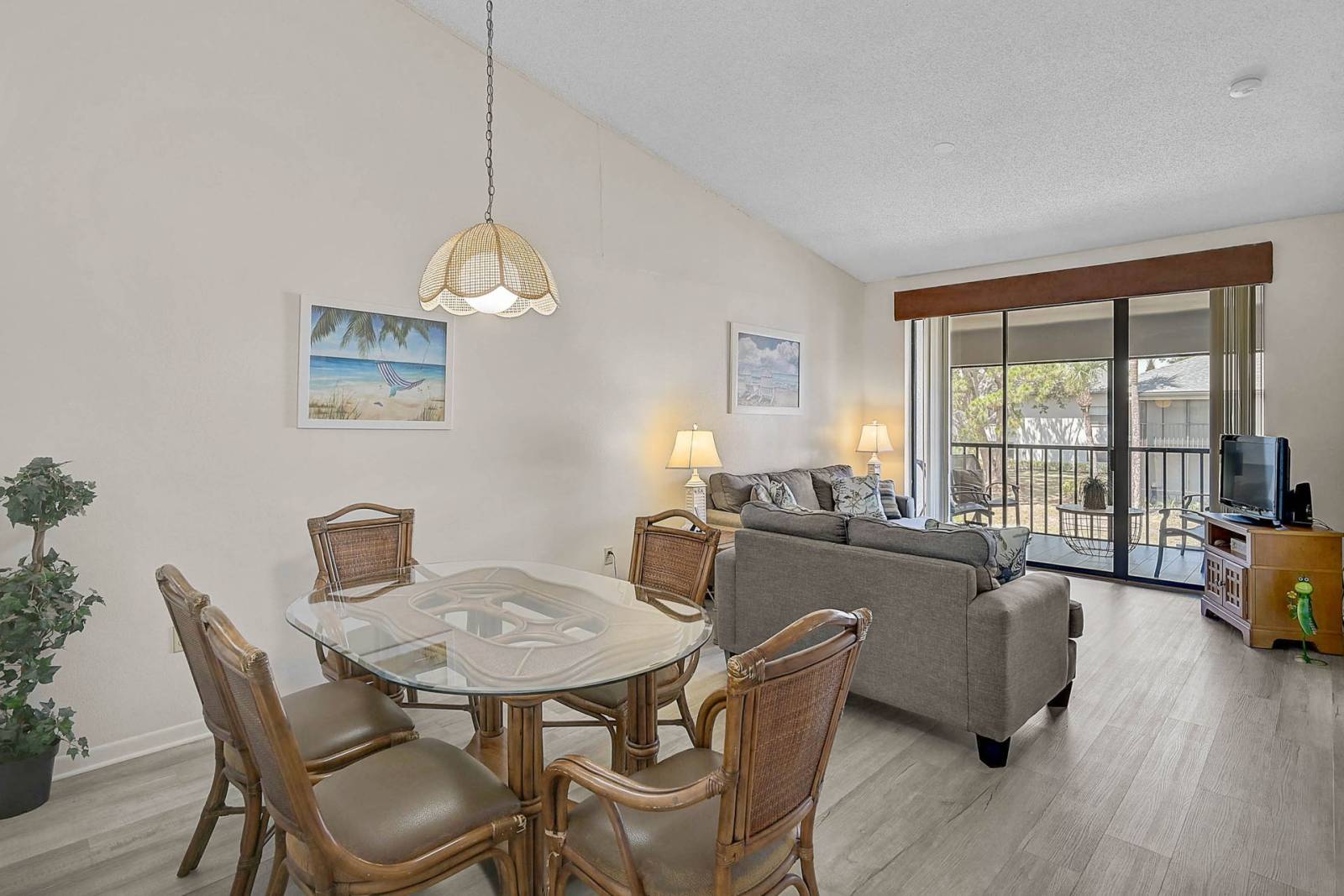 Dining room with seating for four and open to living room and kitchen.