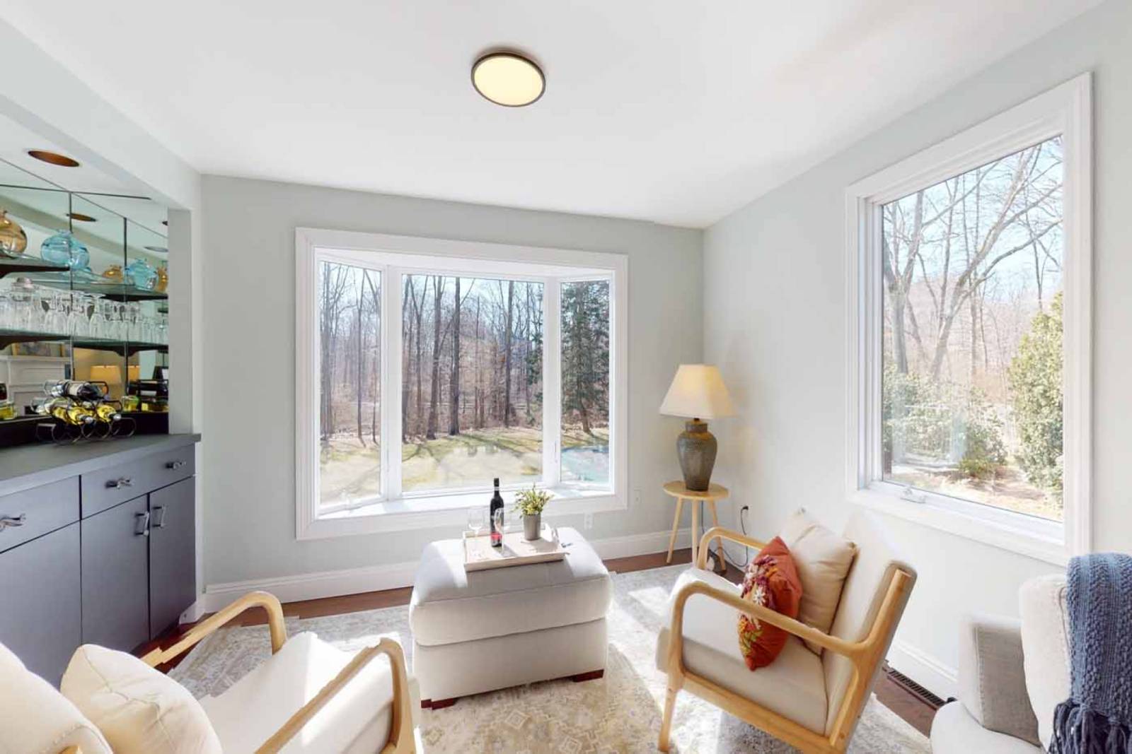 The spacious living area boasts comfortable seating and a reading nook full of sunlight overlooking the backyard and pool.