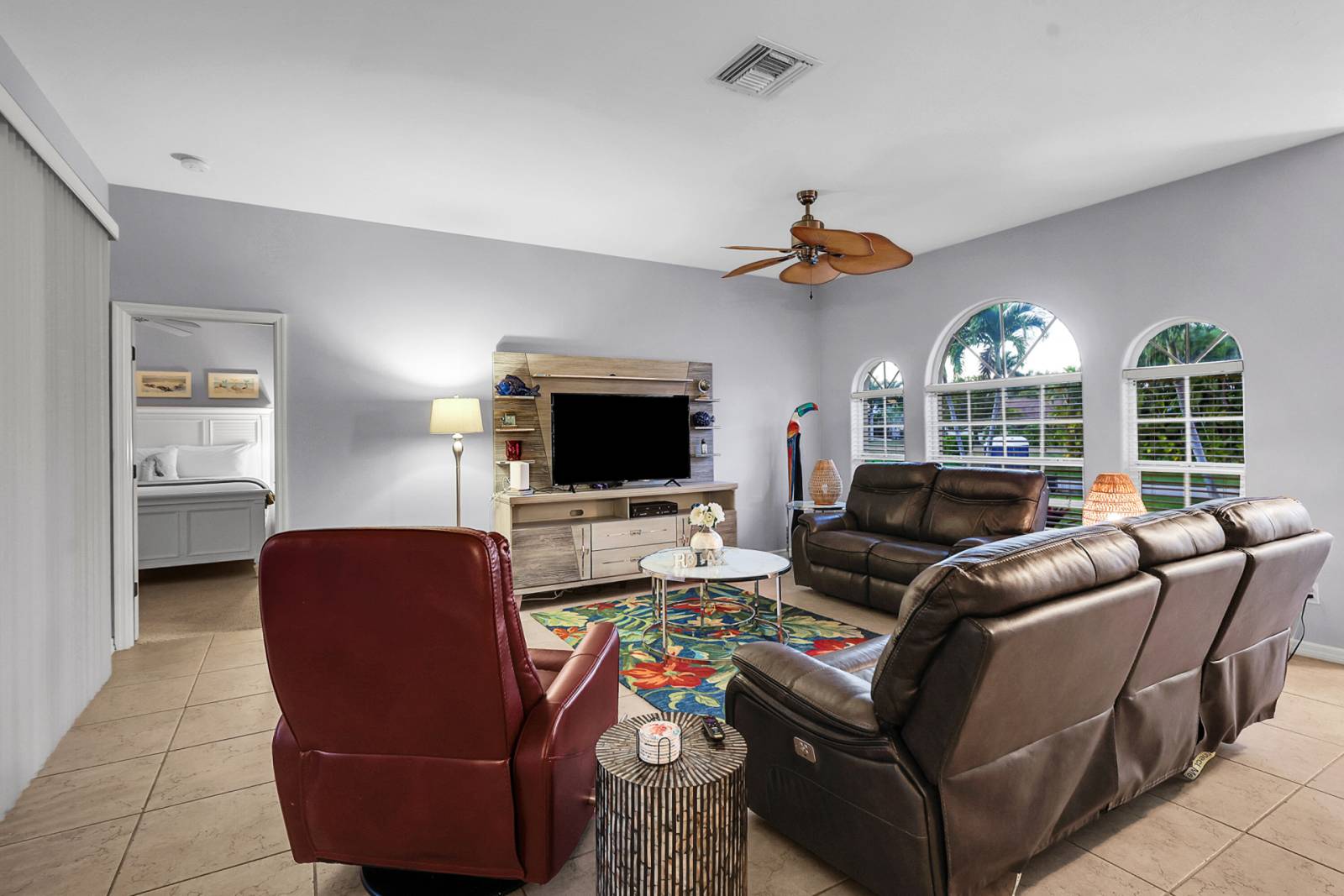 This inviting pool home is located in desirable Southwest Cape Coral and offers a relaxed retreat for families or groups looking to enjoy Southwest Florida. Framed by swaying tropical palms, the home welcomes you into a comfortable, family-friendly setting with 3 bedrooms and 2 bathrooms, plus plenty of space to unwind and enjoy time together.