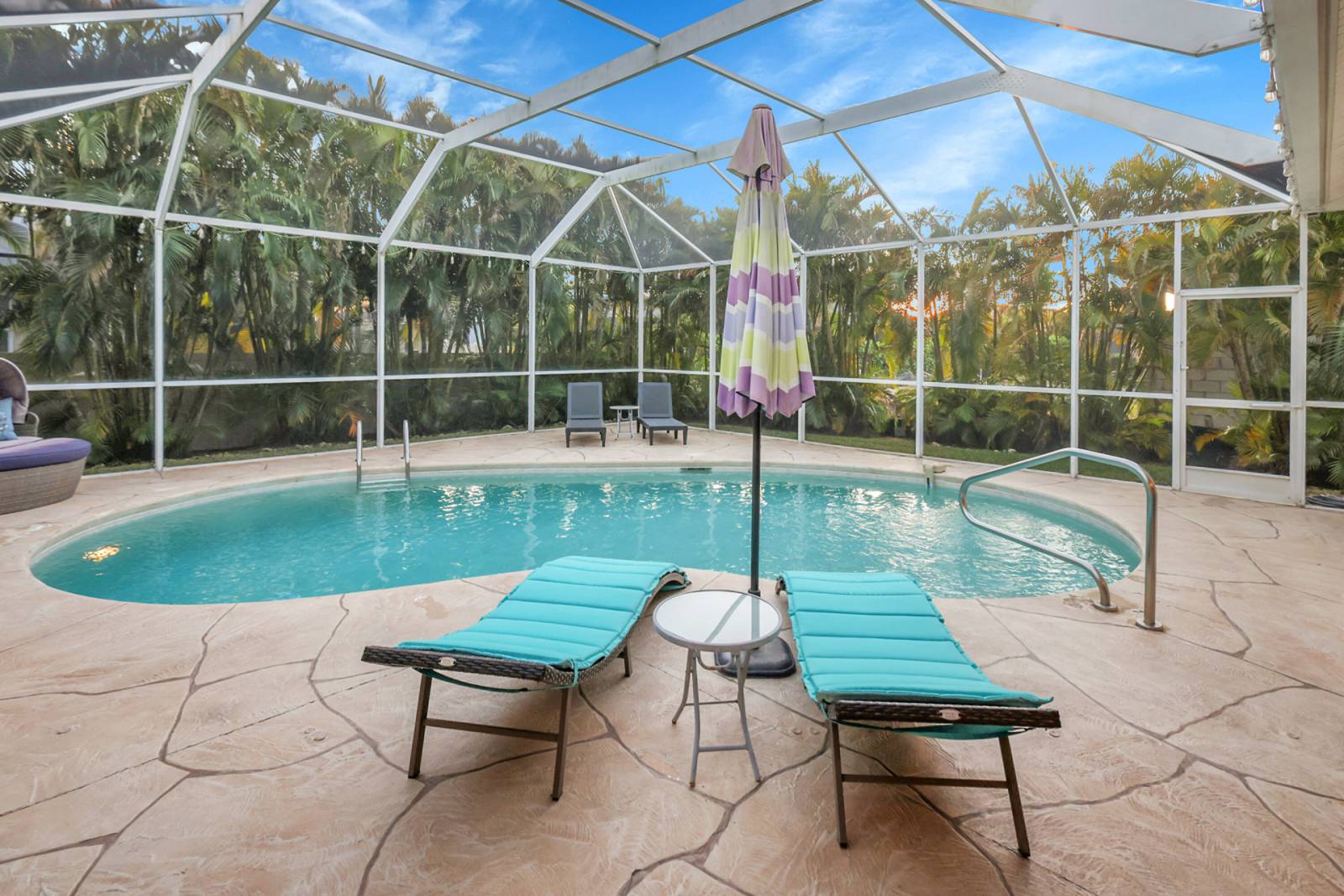 Enjoy Florida’s outdoor lifestyle on the fully screened lanai featuring a heated swimming pool, a sundeck with reclining sun loungers and a sunbed, and a covered outdoor dining area with seating for six. The yard is surrounded by tropical foliage, and a gas grill is available for guest use (propane purchase is the responsibility of the guest).
