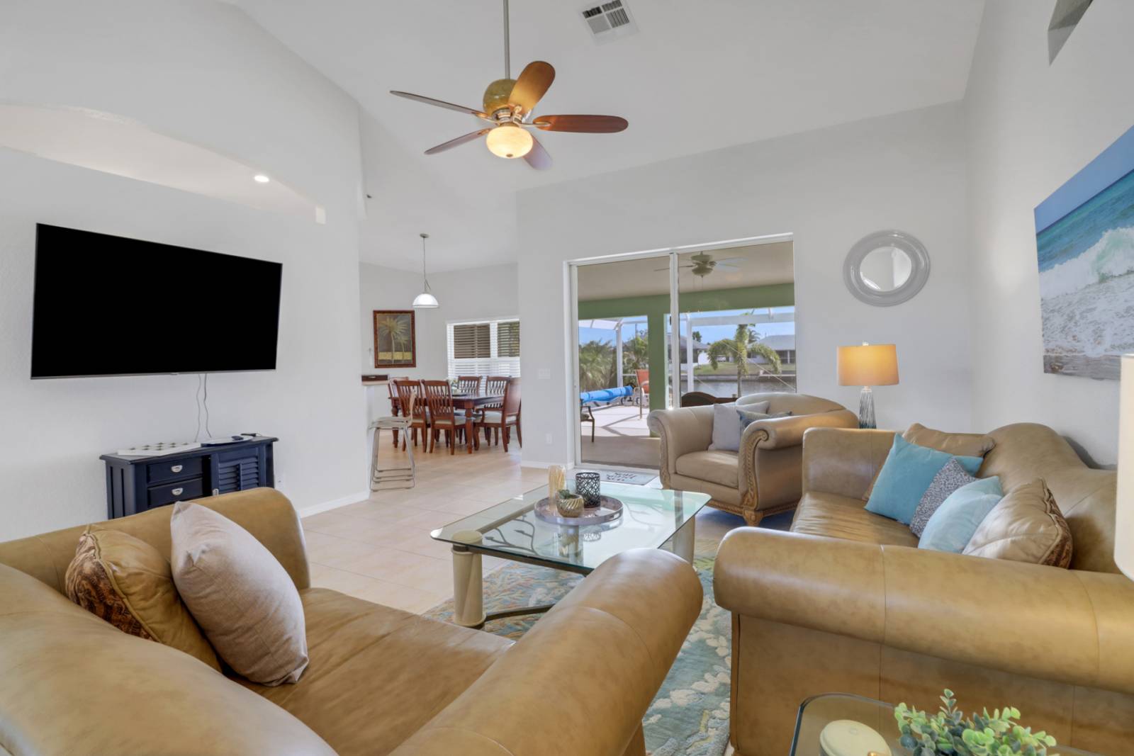 Step outside to your private screened lanai, where a heated, saltwater pool invites you to relax and enjoy the sweeping view of the wide canal that runs behind the home. Various seating options are available around the pool deck, including sun loungers and covered dining. A propane grill is provided for your use, with the purchase of propane (if needed) to be the responsibility of the guest.