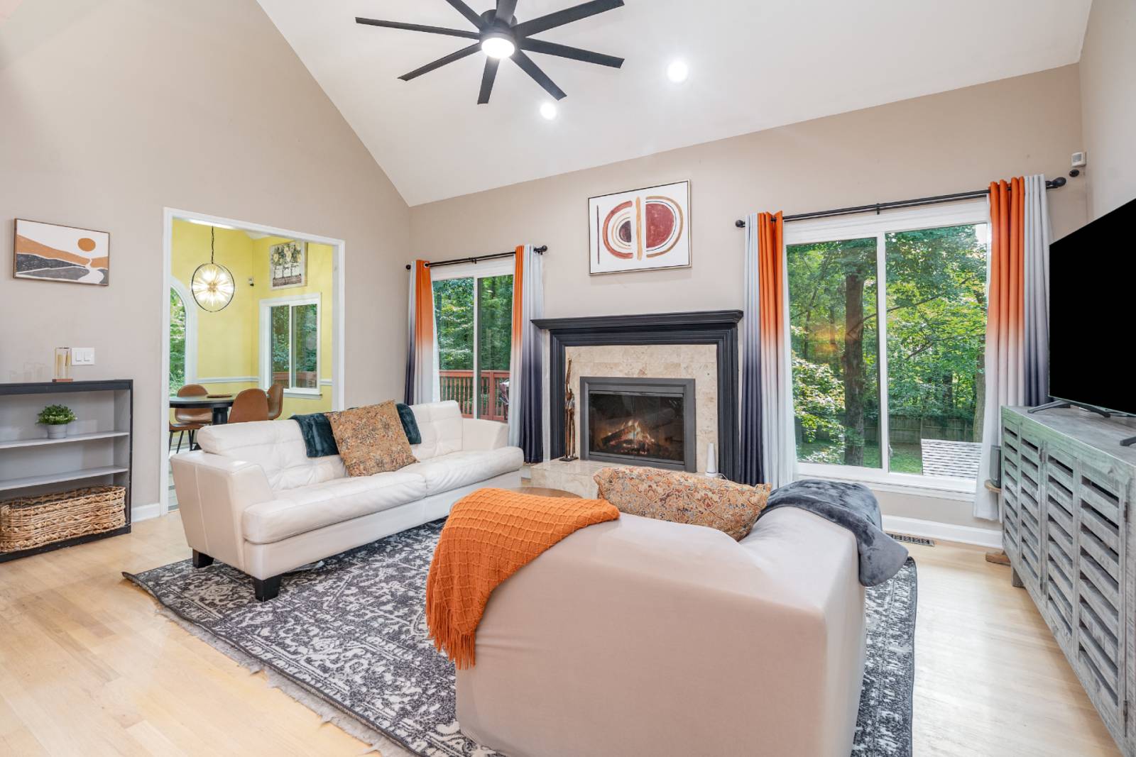 - Warm & Welcoming Living Room – Gather with loved ones around the fireplace or enjoy a movie night on the 55” Smart TV.