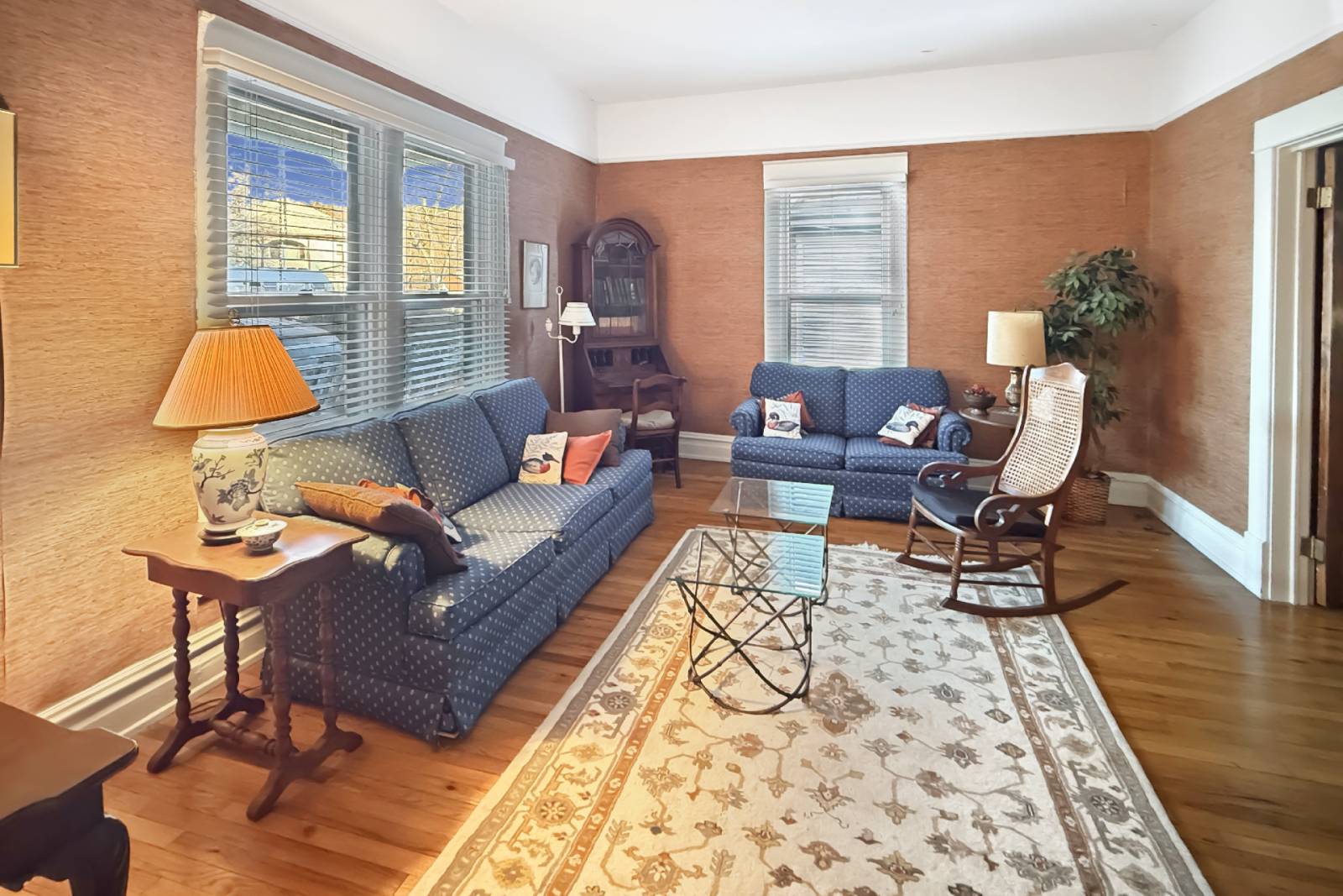 Enter into the bungalow via a large foyer with views of the living, dining and kitchen areas as well as lovely original wood stairs leading to the 2 bedrooms and 1/2 bath upstairs. Also located on the 1st floor is a sitting room, that connects the living room and bedroom, which could be used as a sitting room, office or closet for the bedroom. Lastly, there is full bath, eat-in kitchen area and a enclosed back porch equipped with a washer and dryer to round out the 1st floor. Upstairs includes two bedrooms and 1/2 bath.