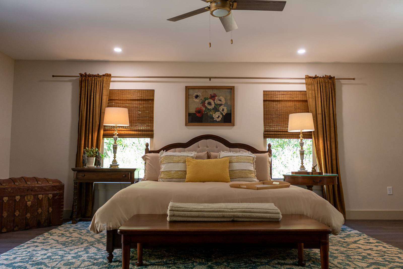 Primary Bedroom (1st floor): King bed, lounge chair, TV, work space and direct access to the patio
