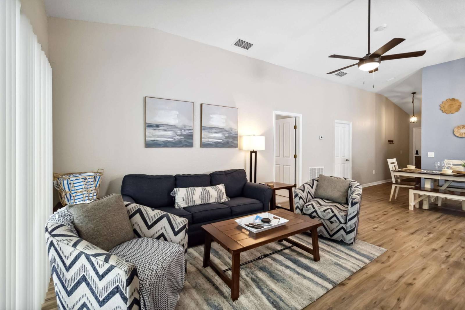 Enjoy a bright, open floor plan with plenty of room to gather, relax, and make lasting vacation memories. The fully equipped kitchen features granite countertops and stainless steel appliances, perfect for preparing meals or snacks before heading out for the day. The dining area overlooks the backyard pool, bringing in natural light and creating a welcoming space for family dinners.