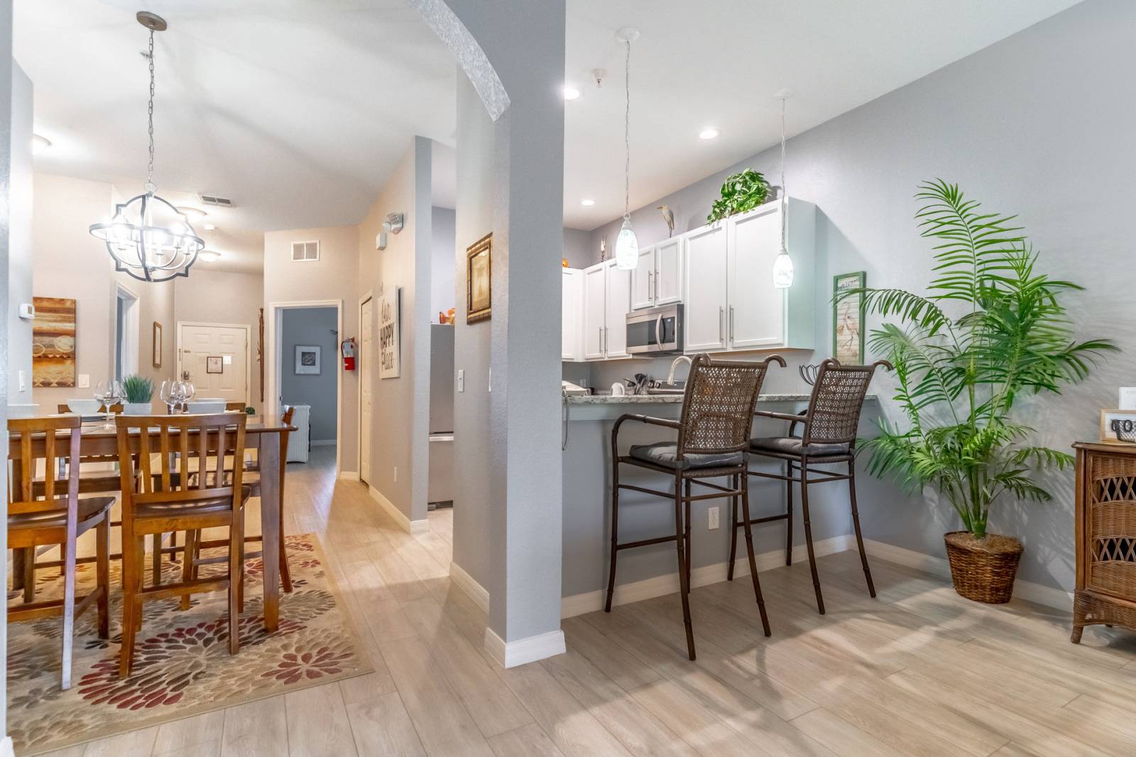 - Fully Equipped Kitchen: Whip up delicious meals in the fully stocked kitchen, complete with a breakfast area with 2 bar stools. The adjacent dining area is perfect for family meals, conveniently located next to the nicely appointed living area with a new 42-inch, flat-panel TV, DVD player, and free high-speed wireless internet.