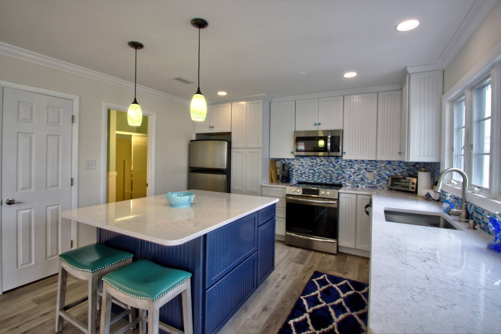 Recently completed renovations include new mattresses, luxury flooring throughout the first floor, fresh paint, spacious and tastefully redecorated modern living room, new dining room table with chairs for eight, new lighting, new kitchen with premium, non-porous Quartz counters, custom cabinetry with large floor to ceiling pantry for guest storage, new Frigidaire dishwasher, range-oven, and microwave. This home includes a combination drip and k-cup coffee machine. In addition, the second floor master bathroom has a gorgeous new, tiled walk-in shower. There are three full baths with one on each floor, and stackable washer/dryer on the first floor.