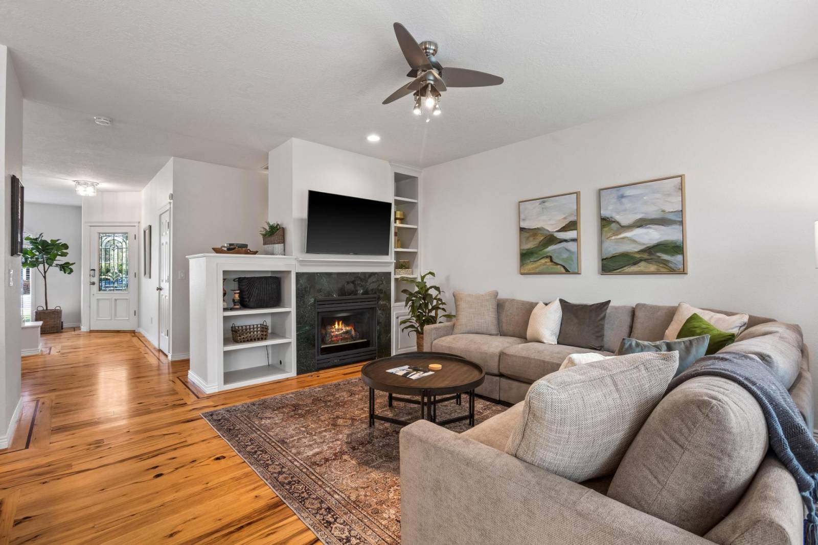 • Light-filled living room with cozy fireplace and LG Smart TV