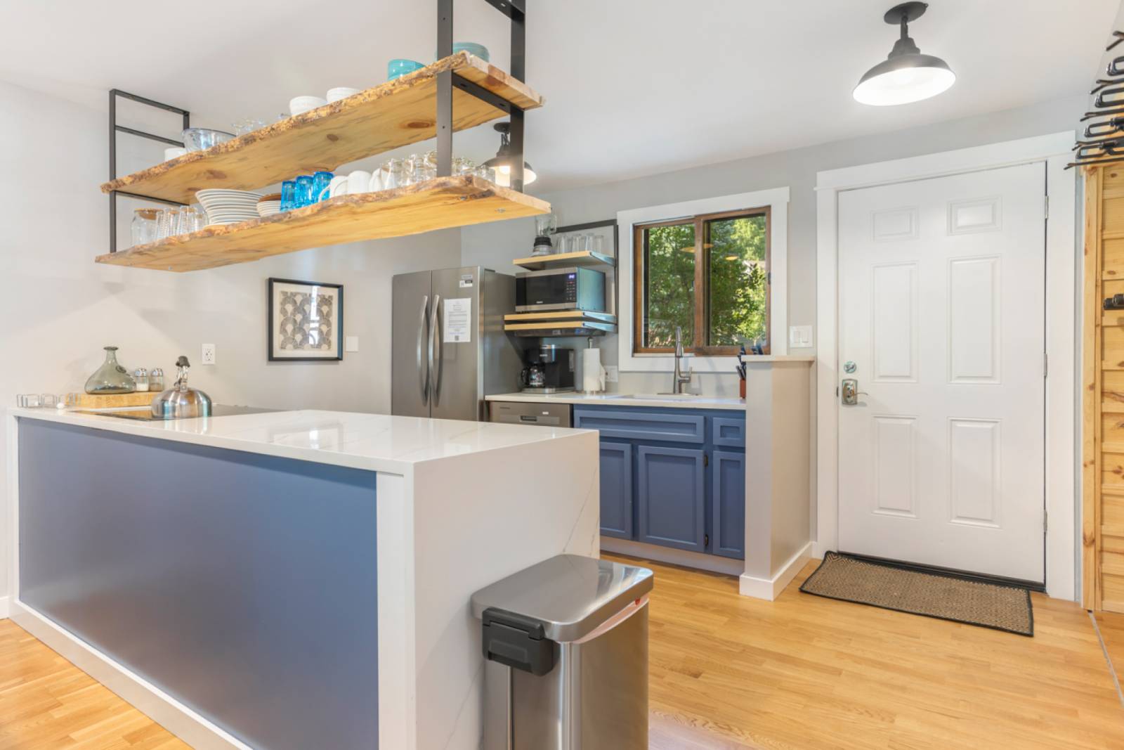 The attractive upper level loft features a king bed with a ceiling fan, large screen smart tv, and private access to the upper balcony, where you can step out in the morning for a breath of mountain air! A full bath with a single vanity and Tub/Shower Combination is located off the hall. Bedroom 3 is furnished with a full bed. This comfortable home sleeps 8 in 4 beds. Most mountain residences, including this property, do not have air conditioning. Fans are provided in the home for your comfort.