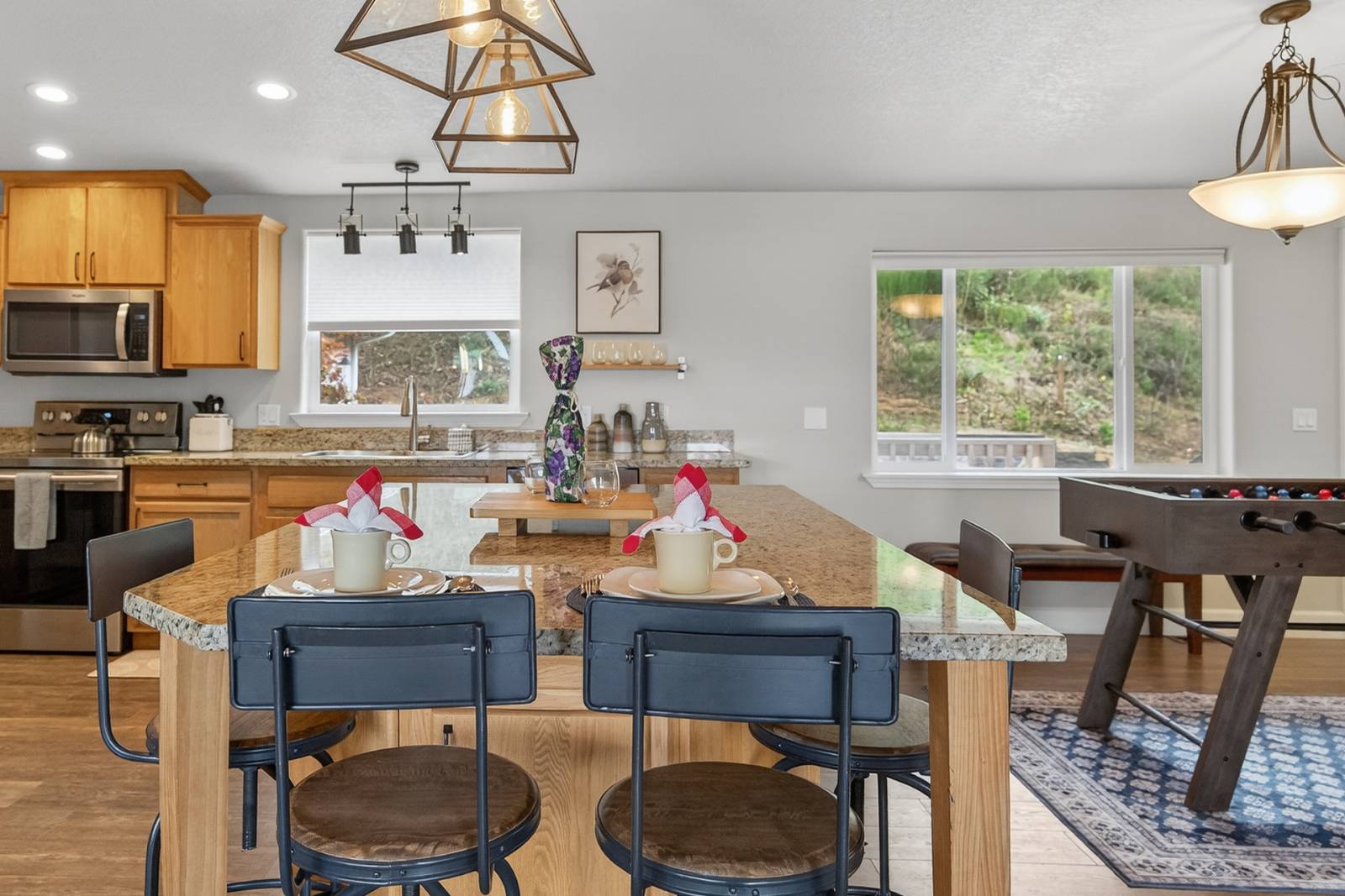 A spacious master suite with king bed and lake views, two additional bedrooms with queen beds and the same incredible lake views, walk in shower as well as a tub, large kitchen and dining area with plenty of seating for the whole family. Cozy living room and family room, an out door dinning area with a gas grill, foosball table, and dining table with seating for six.