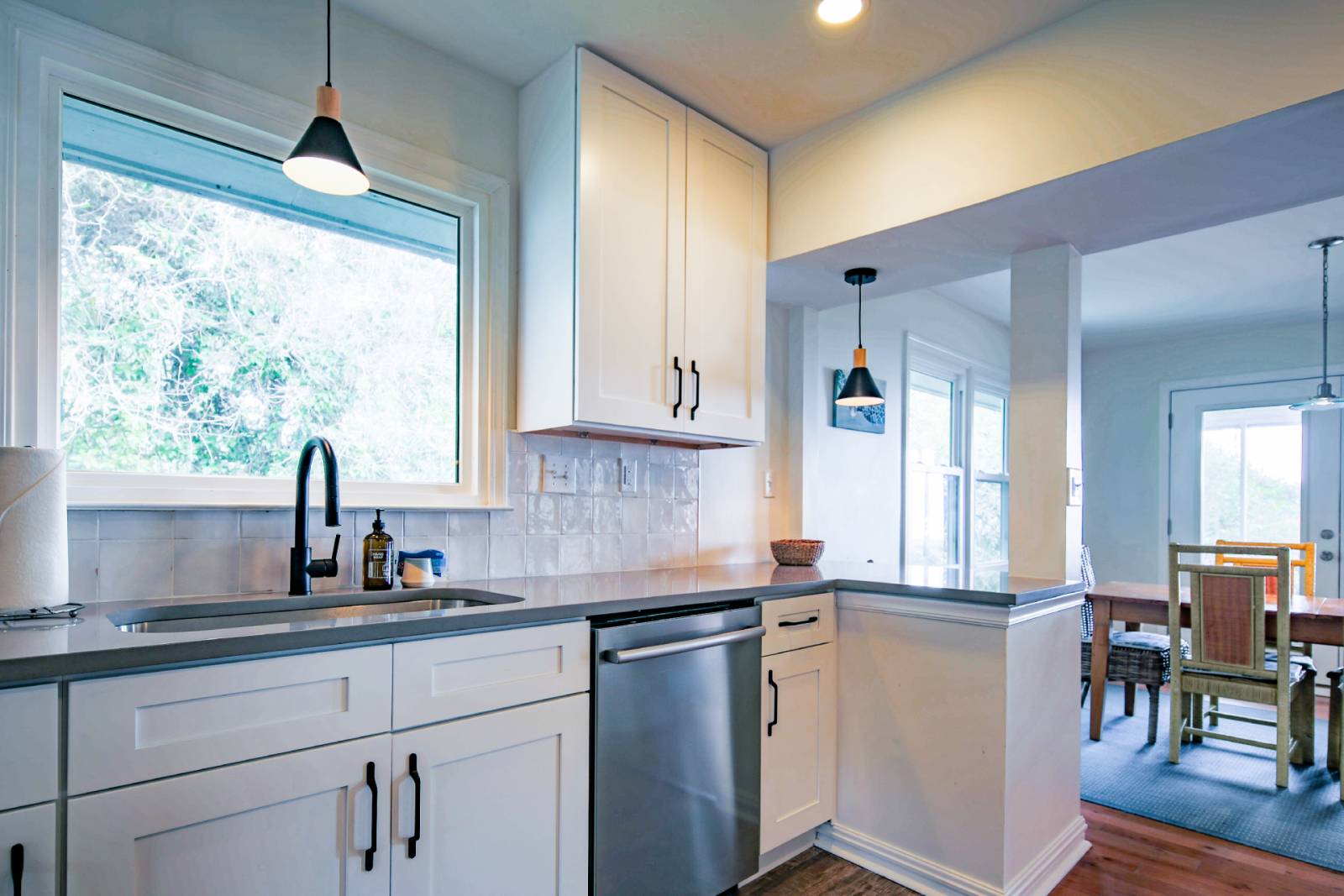 * Spacious newly renovated kitchen with white cabinetry, tiled backsplash and stainless steel appliances