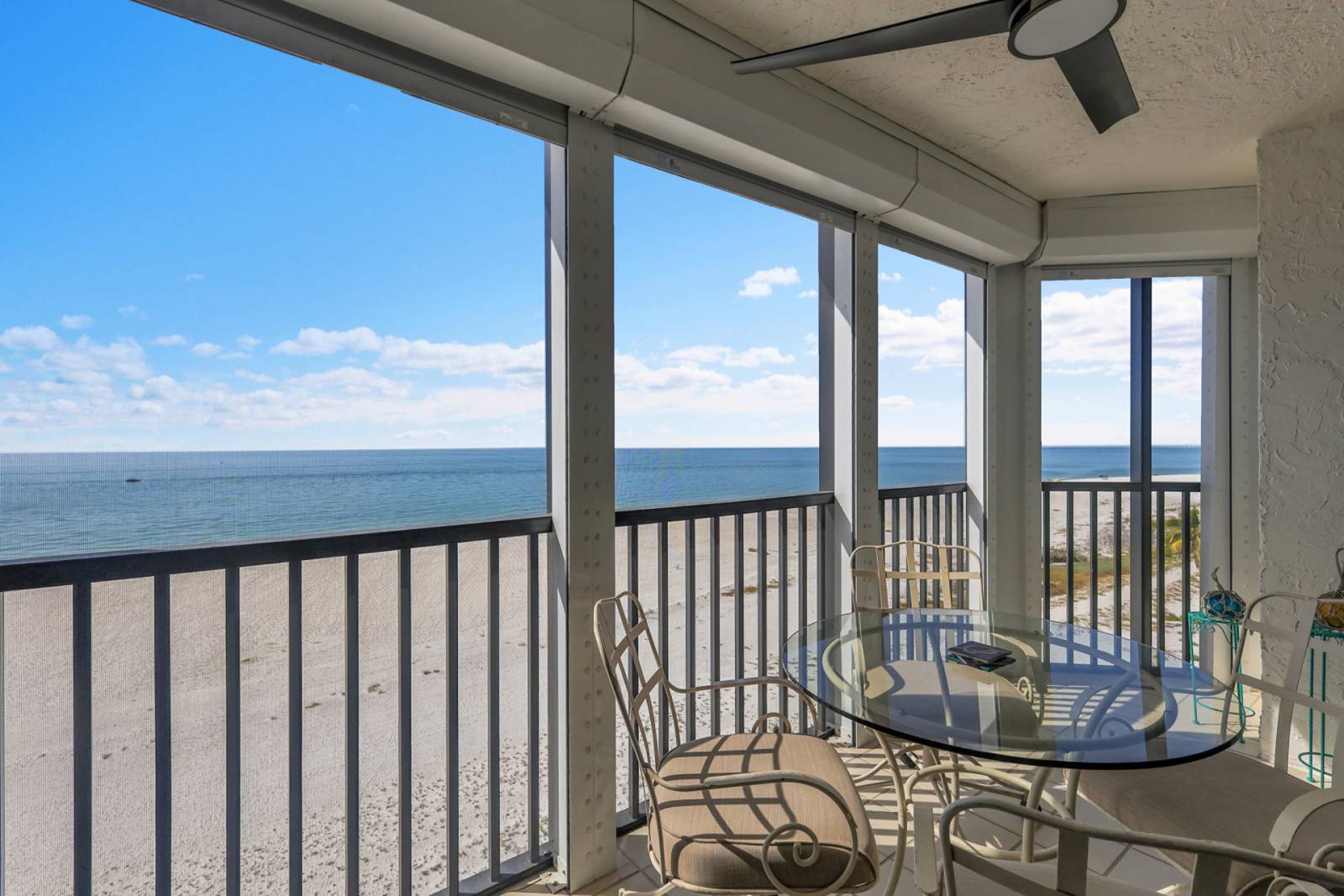 The screened, furnished balcony, accesible from the living area room, overlooks the Gulf, offering the perfect spot to catch every sunset during your stay