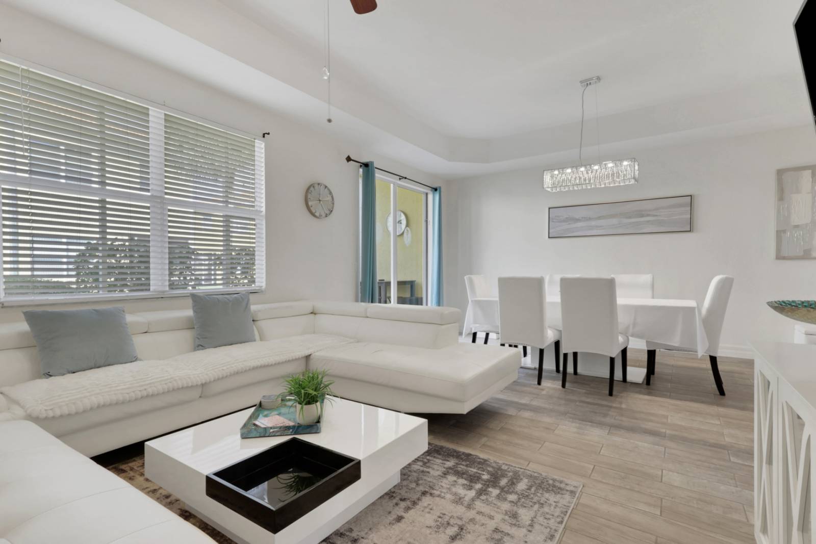Large, open concept living/dining/kitchen area tastefully appointed with minimalistic, modern furnishings, large flat screen Smart TV with community provided cable, dining table for 6, and sliding glass doors open to the extended lanai that runs the entire width of the town home