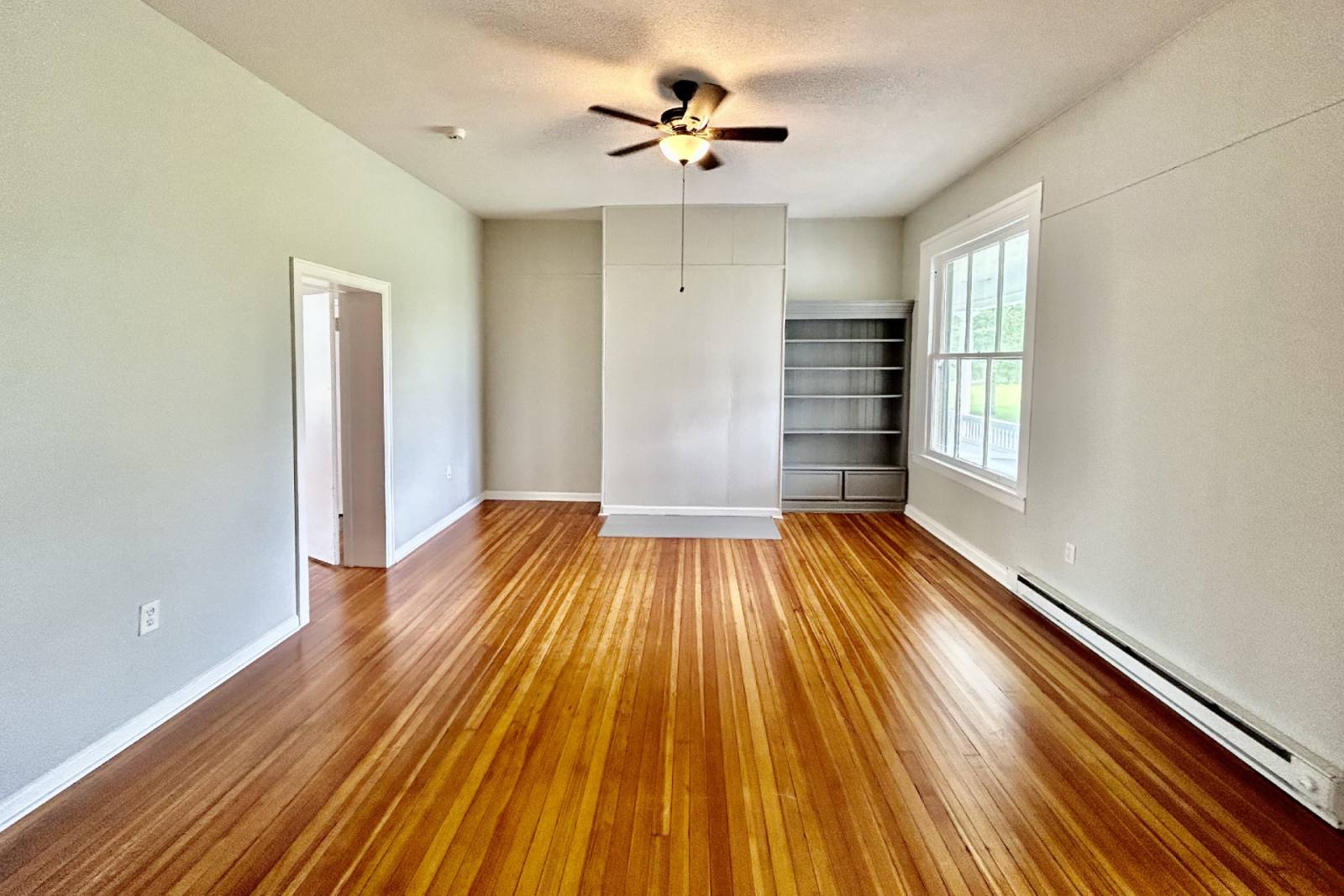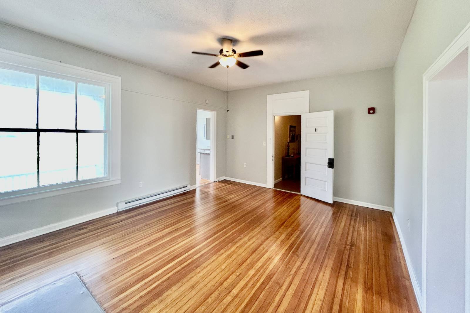 This space provides an inviting and comfortable living room - with ample seating and a large screen TV, it's the perfect spot for relaxing after a day of exploring. The living room sectional sofa and 2 comfy armchairs, as well views of Barnhardt Circle Park, will make it the go to place for family and friends. The large bedroom has a queen size bed, sitting area, dresser, TV and direct access to newly renovated tile bathroom. There also a secondary room, off the bedroom, which could be used as an extra bedroom/nursery, office or extra closet space. Enjoy meals in a bright kitchen, equipped with full size appliances, and windows overlooking the stunningly renovated officer homes and original polo field. Door from kitchen also leads to covered porch overlooking the park.