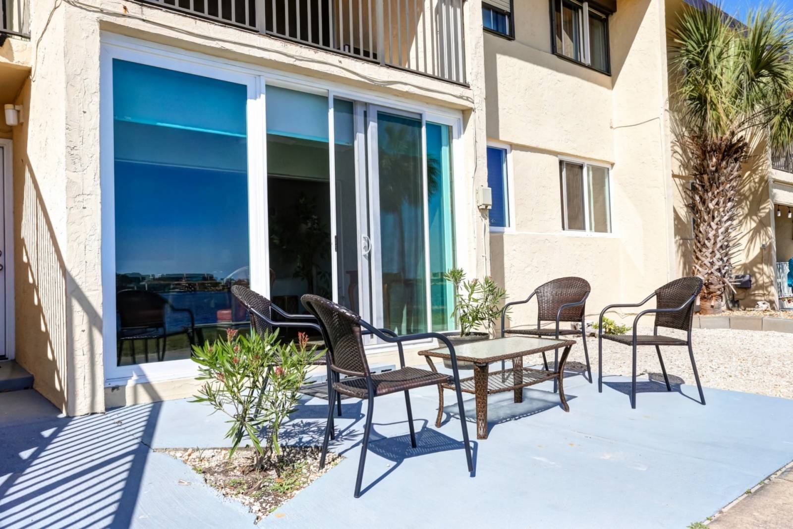 - Patio with chairs overlooking Santa Rosa Sound