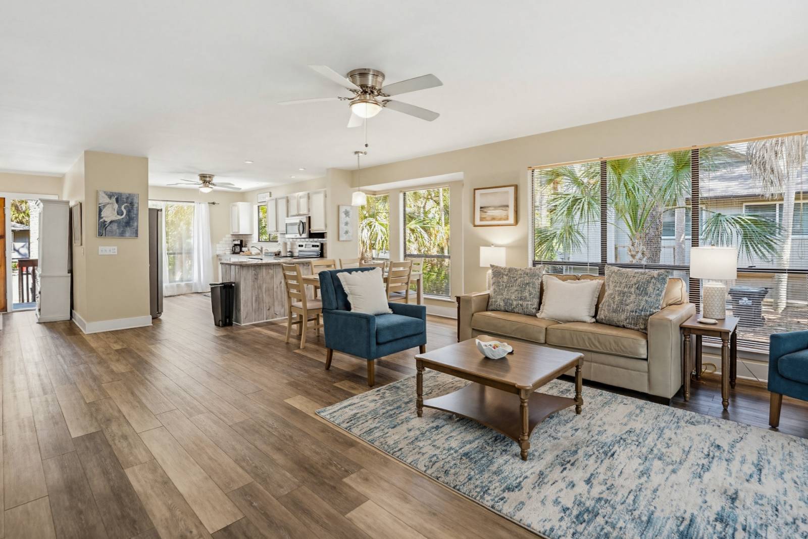 The large windows bring natural light all throughout the living, kitchen, and dining area! The kitchen has plenty of room for you and your family to make a home cooked meal. The breakfast bar is great for a quick snack! The washer and dryer are located off of the kitchen. Enjoy a meal or game night at the dining room table. Feel free to spread out and wind down from the long day you had at the beach. The sliding doors from the living area open up to the back deck with seating and a gas grill. Take your after dinner drinks to the back deck and enjoy the calm area!