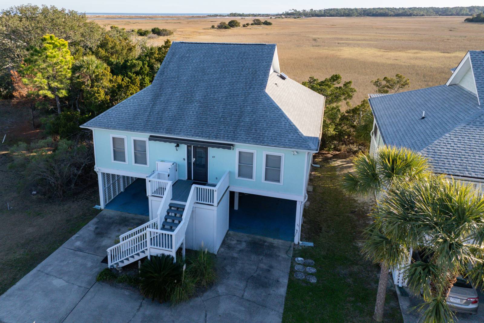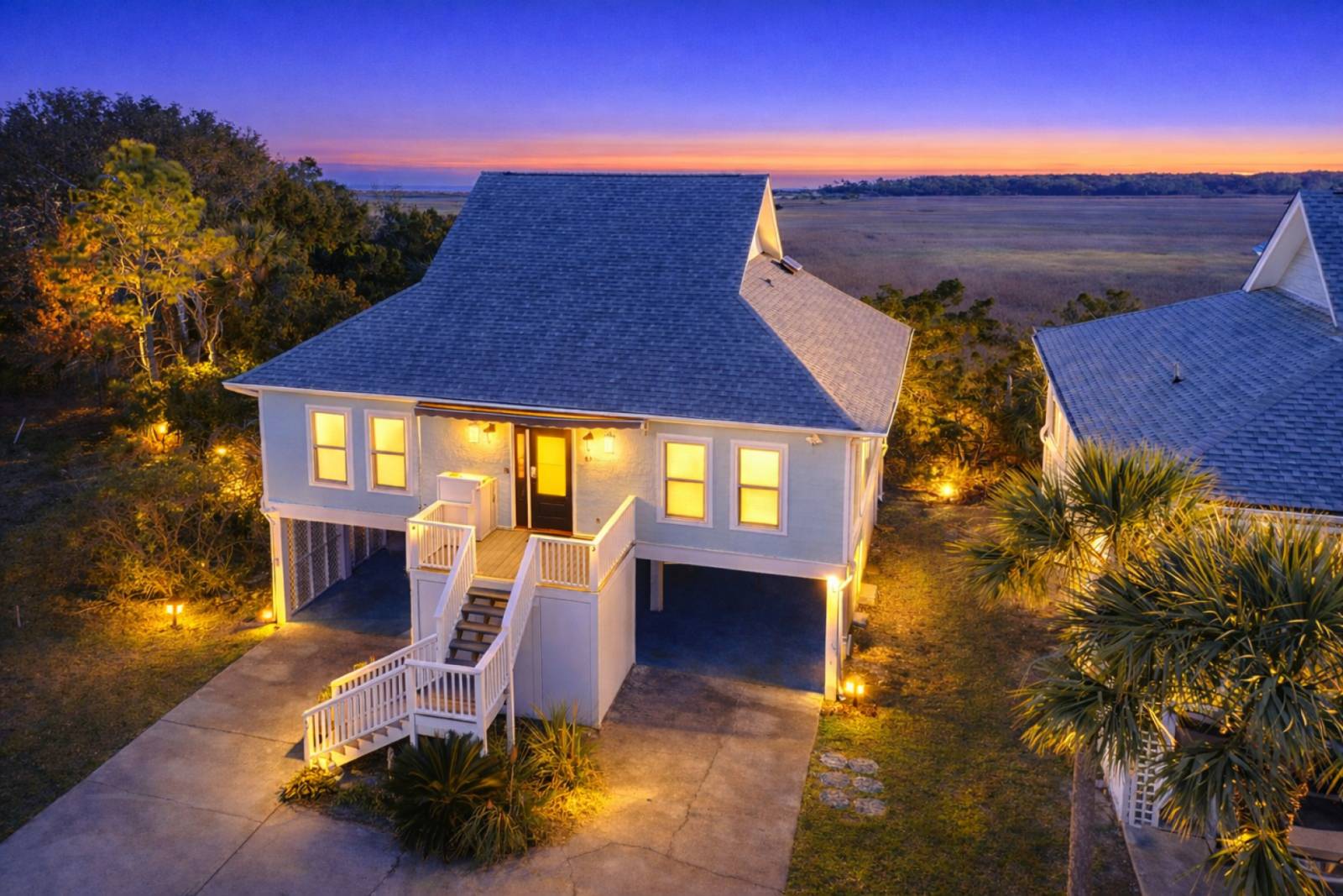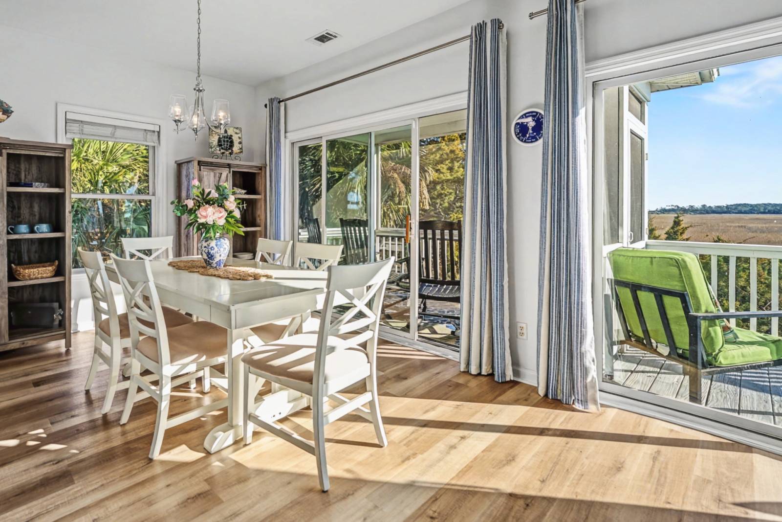 This four-bedroom, three-bath vacation home is thoughtfully designed for both comfort and privacy. The bright, open-concept main level features cozy seating and expansive windows that showcase the marsh beyond. Three sliding glass doors open to a large deck and screened porch—perfect for morning coffee, sunset cocktails, or simply watching the tides roll by.