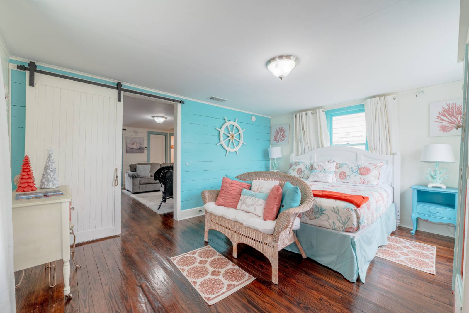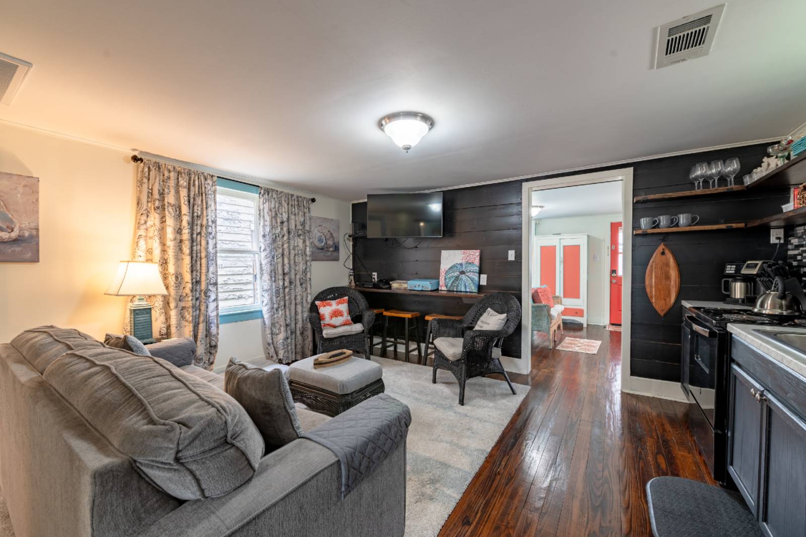 Palm Tree Paradise Tiny Home - Galveston, TX - Discover this cozy beachside haven just two blocks from Galveston's peaceful beaches. Perfect for up to 6 guests, our tiny home features two snug bedrooms, a private fenced backyard, and a charming living space.