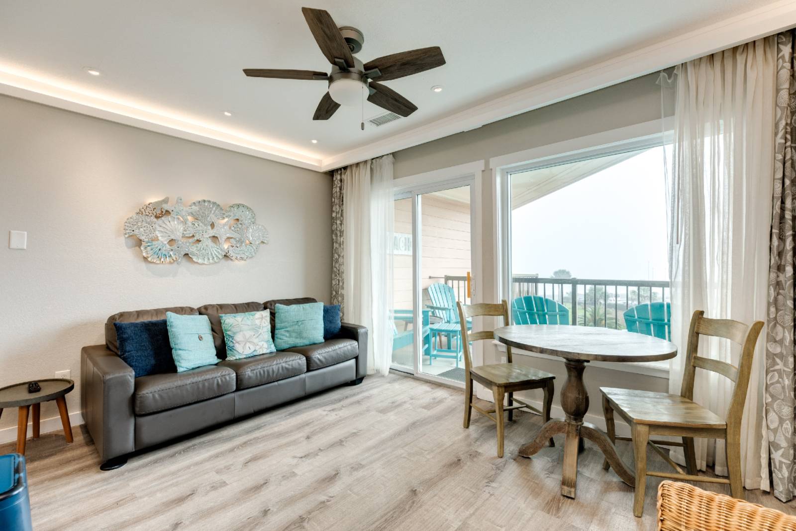 Welcome to Seashell Smile, your perfect beach escape in Galveston! Located at Maravilla Condominiums on the quieter west end of Seawall Boulevard. This beautifully updated condo offers relaxing ocean views from the living room, kitchen, and your own furnished private balcony — the perfect spot to enjoy morning coffee or unwind at sunset. Inside, you’ll find a king bedroom with plush bedding, a leather queen sleeper sofa, Smart TV, and stunning cove lighting that creates a warm coastal ambiance. The fully stocked kitchen features stainless steel full-size appliances, quartz countertops, and a custom seashell tile backsplash. The spa-like bathroom includes an oversized tiled shower and jetted soaking tub with a quartz vanity for a touch of luxury.