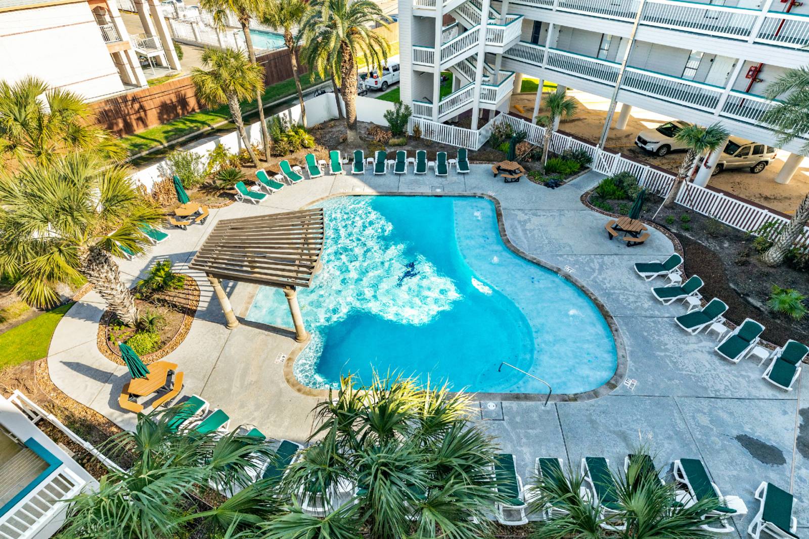 This beach front condo is just a few steps from Galveston Island's beautiful beaches. Wake up to a sunrise over the Gulf Coast on the balcony before a long day at the beach. Take a dip in the heated pool while enjoying the gulf breeze. The shaded outdoor picnic areas offer dining tables and charcoal grills. Laundry facilities are also included!