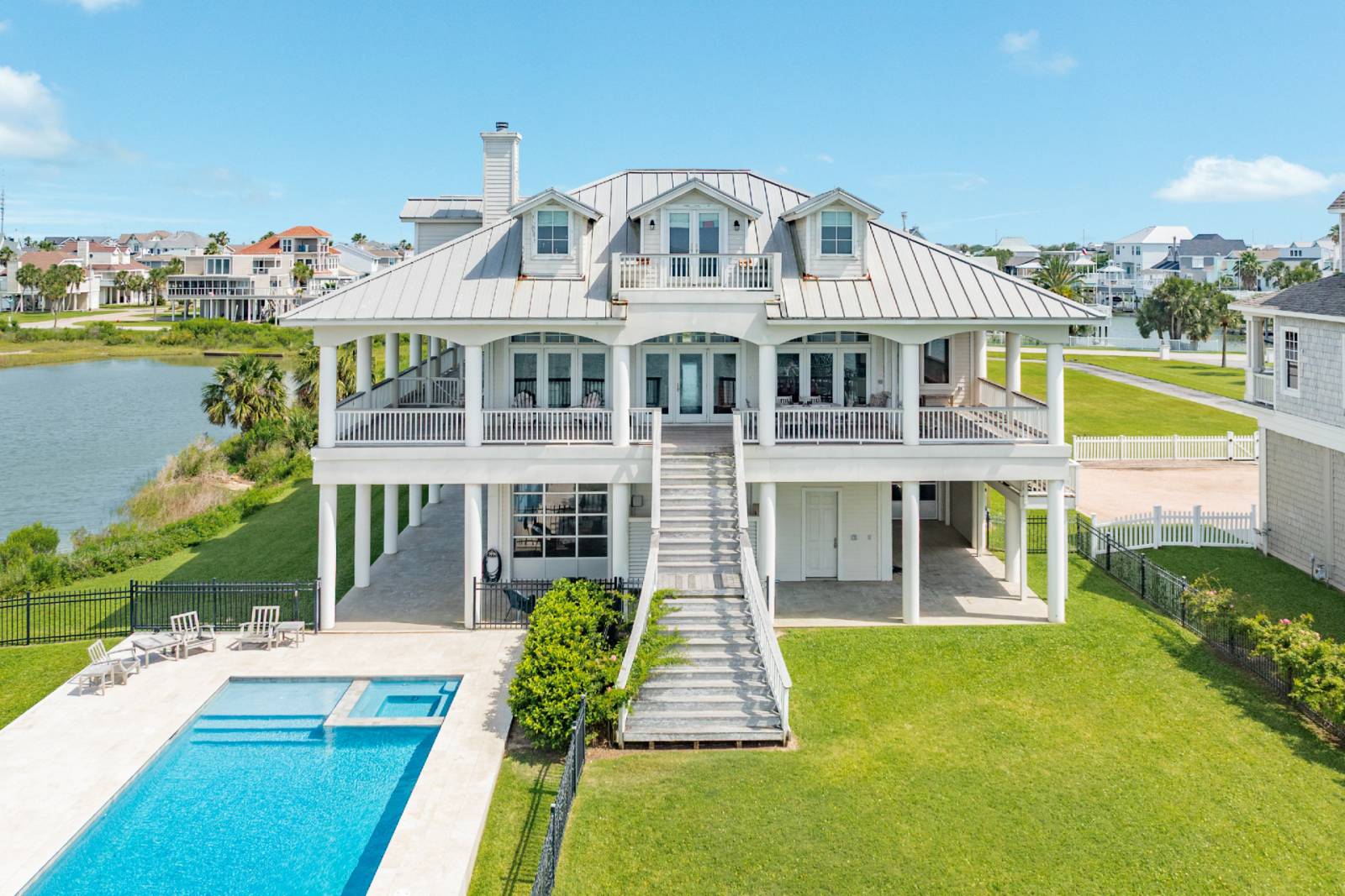 Experience the height of coastal living at this expansive all-suite 6-bedroom, 6.5-bathroom getaway, set directly on the tranquil waters of Galveston Bay. Perfect for entertaining or relaxing, this stunning home combines upscale comfort with endless opportunities for fun.