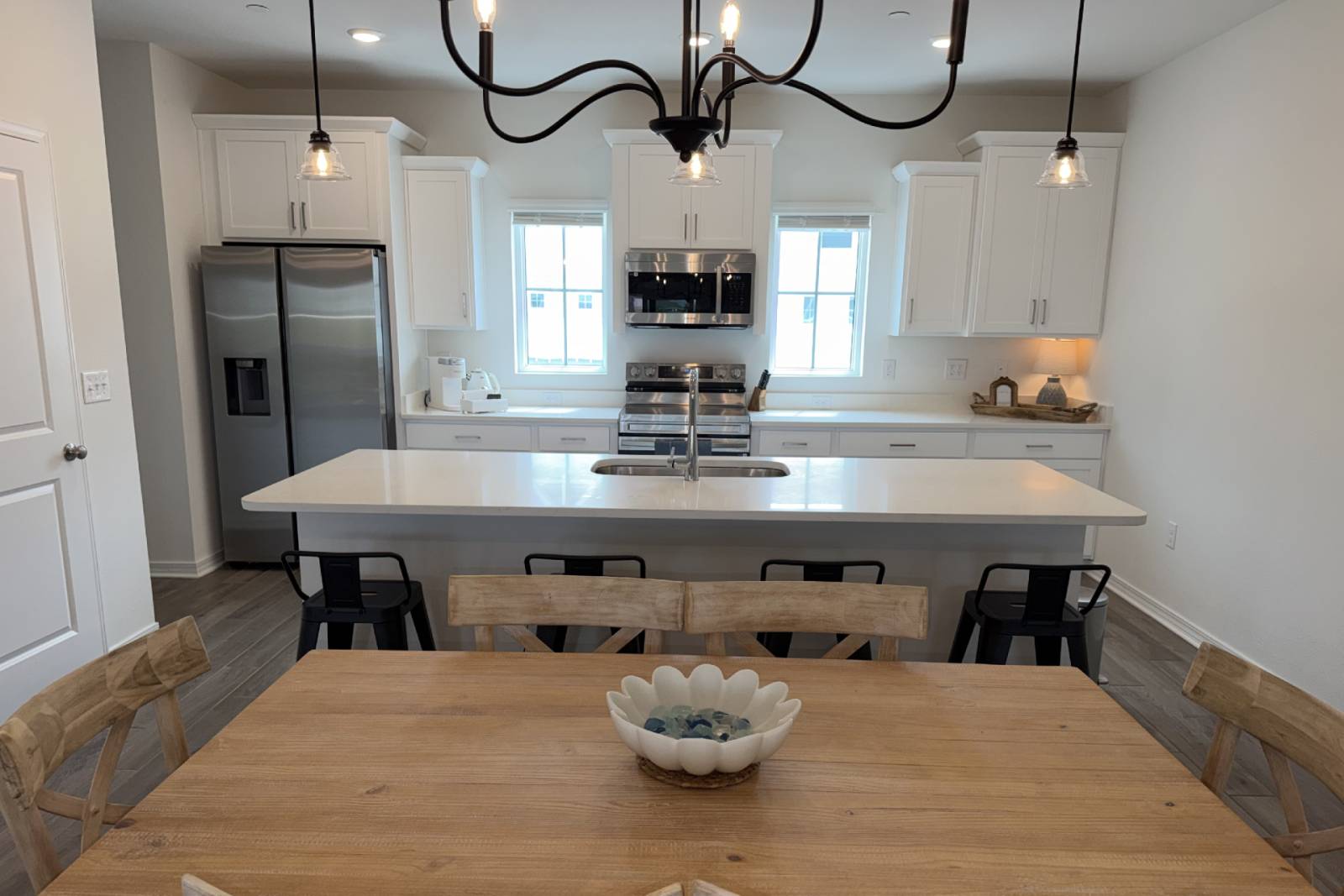 Gather around the farm‑style dining table for 6, or enjoy casual meals at the large island with seating for 4. Custom artwork adds a personal coastal touch.