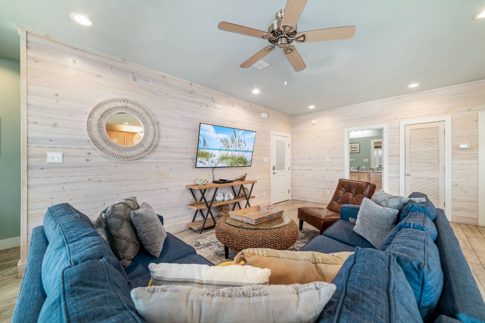 Ashore Thing is your next favorite beach getaway! This gorgeous three-bedroom, four-bath home sits right across the street from the sand and surf, with deeded beach access just 150 feet away. Even better? There’s a stoplight at the entrance, making beach days easy and stress-free.