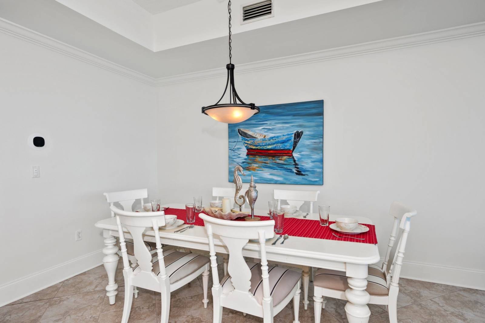 • Fully equipped kitchen with everything you may need in your home away from home. The dining table seats six, plus a small table with four chairs, and three barstools for extra seating.