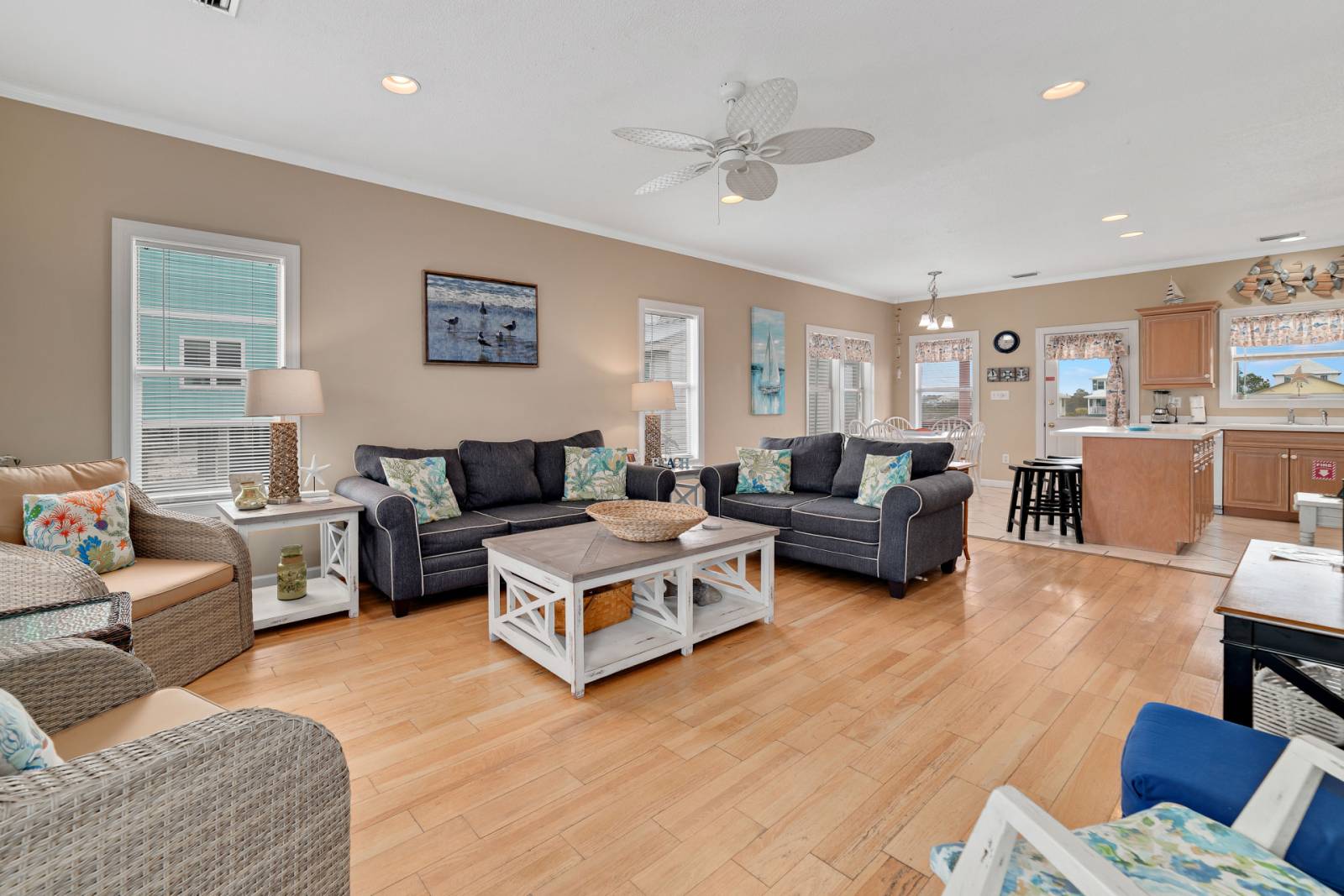 Good Winds is a spacious four-bedroom, three-bath home on West Beach, perfect for families or groups seeking comfort, space, and coastal charm.