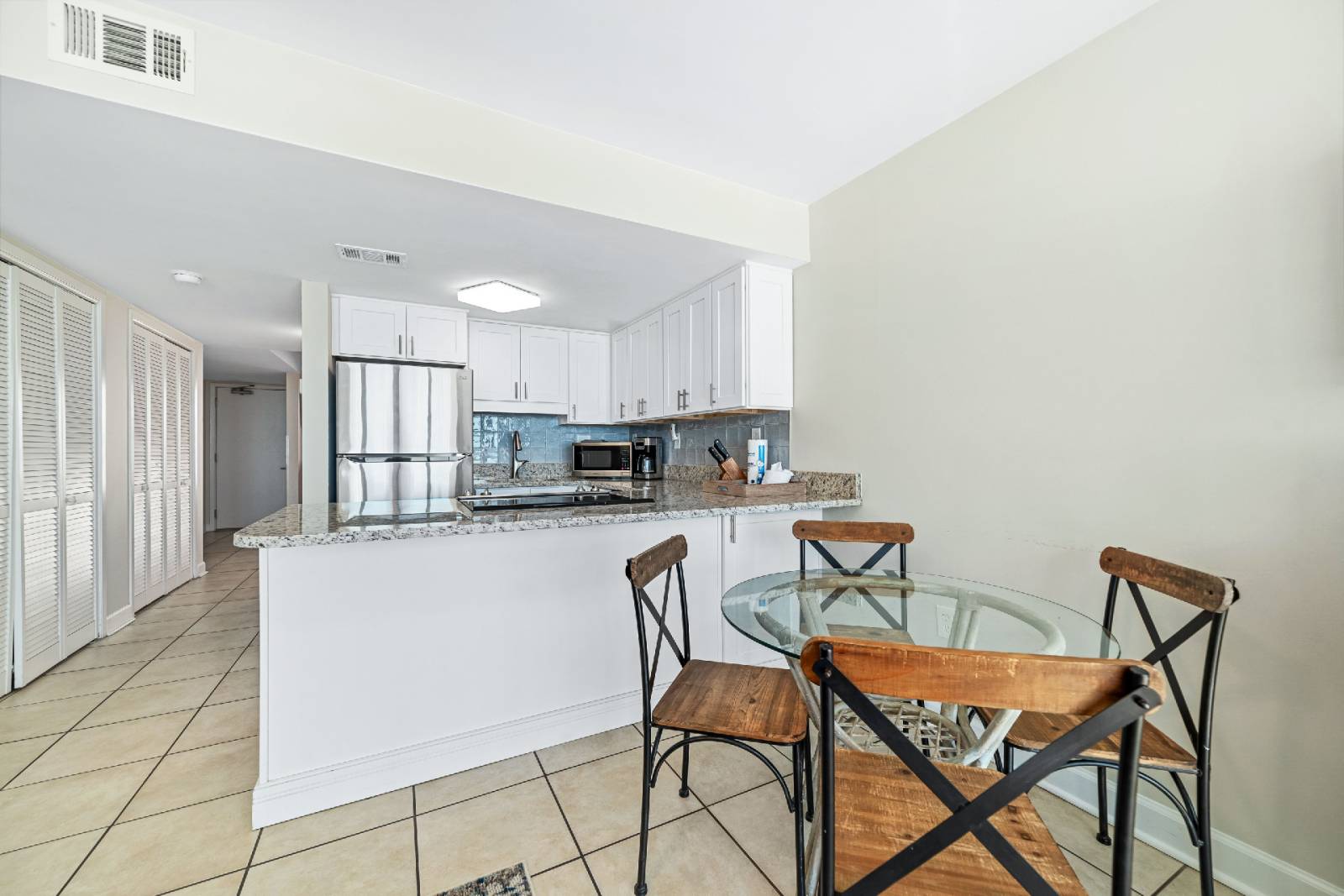 • Fully equipped kitchen with everything you need for a home-away-from-home stay. The dining area seats four.