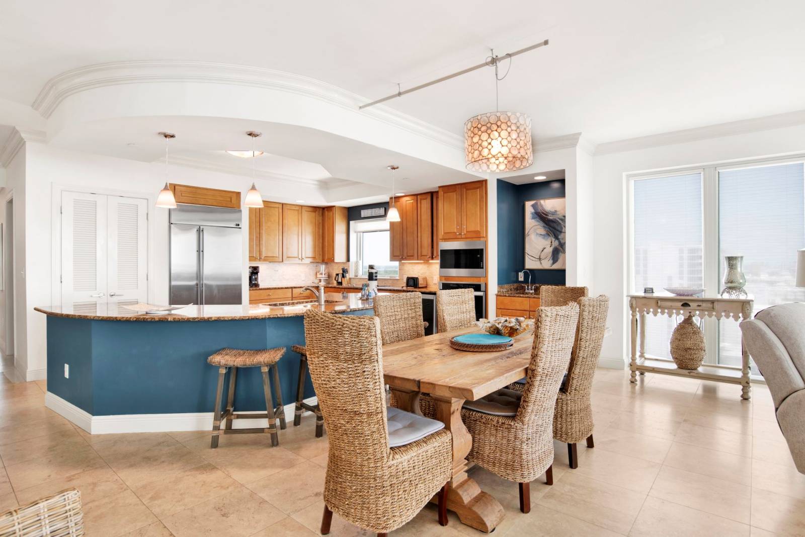 • Fully equipped kitchen with everything you need in your home away from home; dining table seats eight with four barstools for additional seating