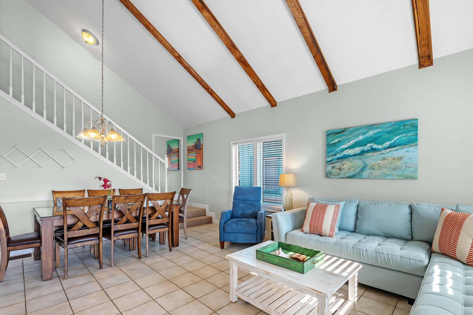 • Fully equipped kitchen with everything you need in your home away from home. The dining area seats six, plus two barstools for additional seating.