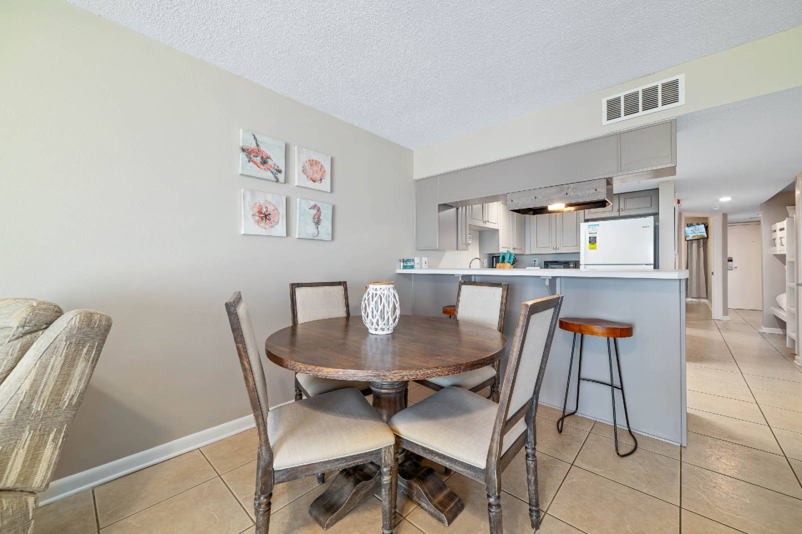 • The kitchen is fully equipped with everything that you could need in your home away from home. The dining area seats four and there are two bar stools for additional seating.