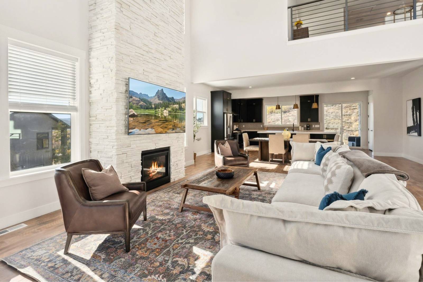 The main level is where everyone ends up - open kitchen, dining, and living space with plenty of room to hang out. Big windows bring in light and mountain views, and the island makes it easy to cook and socialize at the same time.