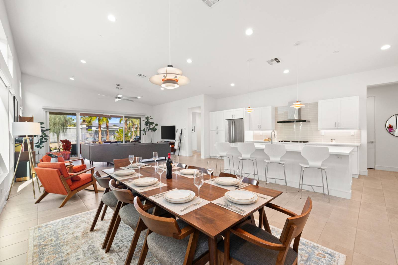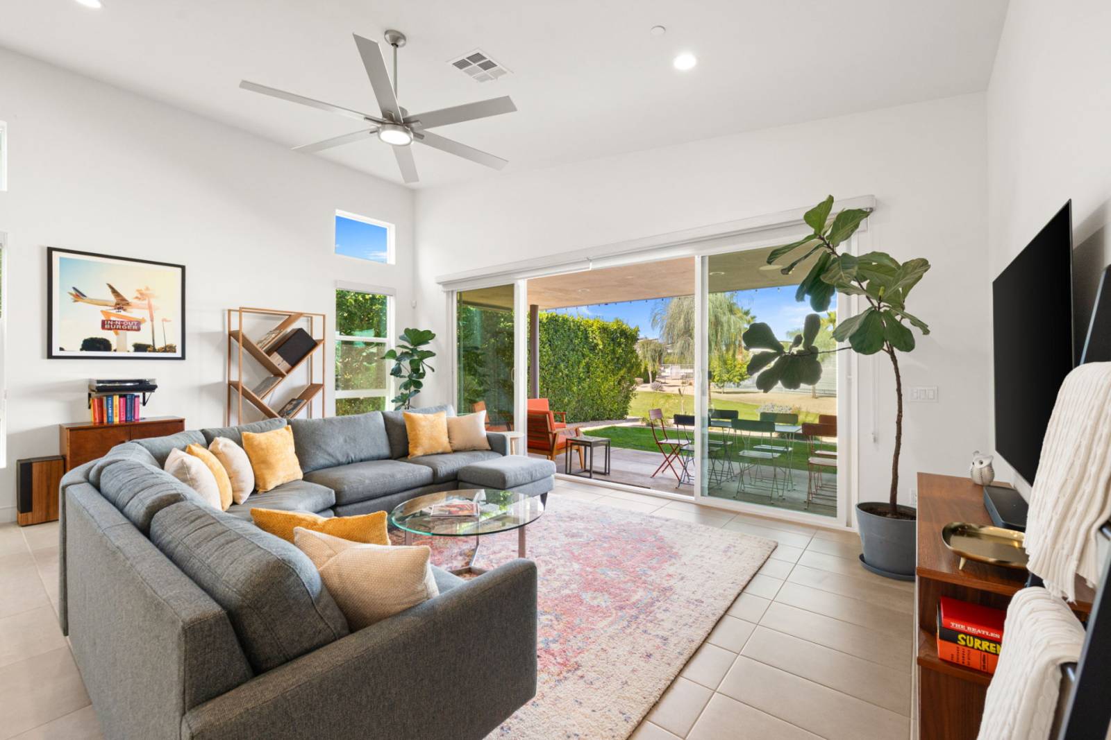 Step inside to a light and bright open floor plan where soft, light-colored tile floors set a clean foundation throughout the main living areas. The living room centers around a large U-shaped gray sofa layered over a coordinating rug, creating an inviting space for gathering. A 60in. SmartTV, books, and a ceiling fan add comfort and functionality, while sliding glass doors open directly to the covered patio, keeping the indoor and outdoor spaces connected. Oversized windows bring in natural light, and a separate seating group for two with a small table offers a quieter corner for conversation or morning coffee.