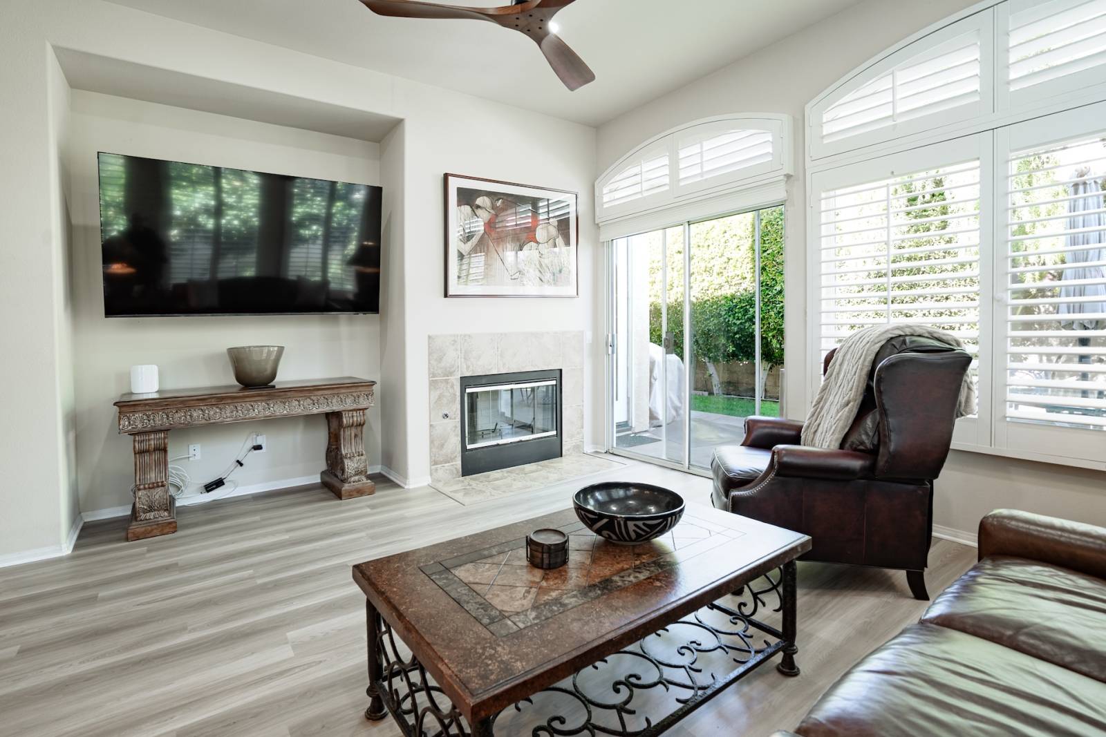 Enjoy the natural light in this warm and inviting space, complete with plush seating, big-screen TV, and fireplace. This welcoming and versatile space is perfect for unwinding and quiet relaxation with friends and family or entertaining.